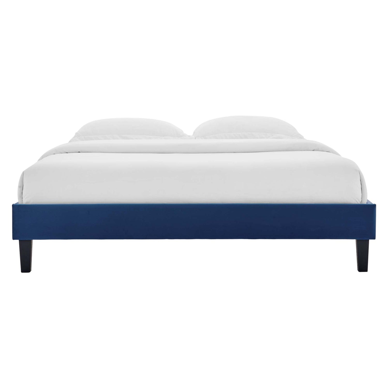 Transform your bedroom decor with the subtle glam deco style of the Reign Performance Velvet Full Platform Bed Frame. Covered in soft, stain-resistant performance velvet, this upholstered bed boasts rich texture on the simple design of the sturdy side rails. Resting atop tapered black wood legs, the full size bed frame is a sturdy mattress foundation for memory foam, latex, innerspring, and hybrid mattresses. Eliminating the need for a box spring, this platform bed is complete with a poplar wood slat support system, a reinforced center beam, and supporting legs for lasting stability. Compatible with a variety of full headboard designs, this full platform bed also makes a striking statement as a stand-alone piece in the guest bedroom or teenager's room. Mattress not included. Assembly required. Full Bed Frame Weight Capacity: 800 lbs.