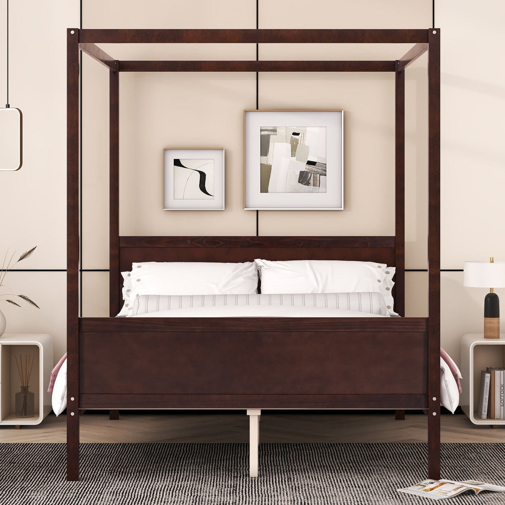 This wooden canopy platform bed offers a refined addition to your bedroom, combining functionality with stylish design. It includes a built-in headboard and footboard, serving as a centerpiece while providing practical storage space beneath.