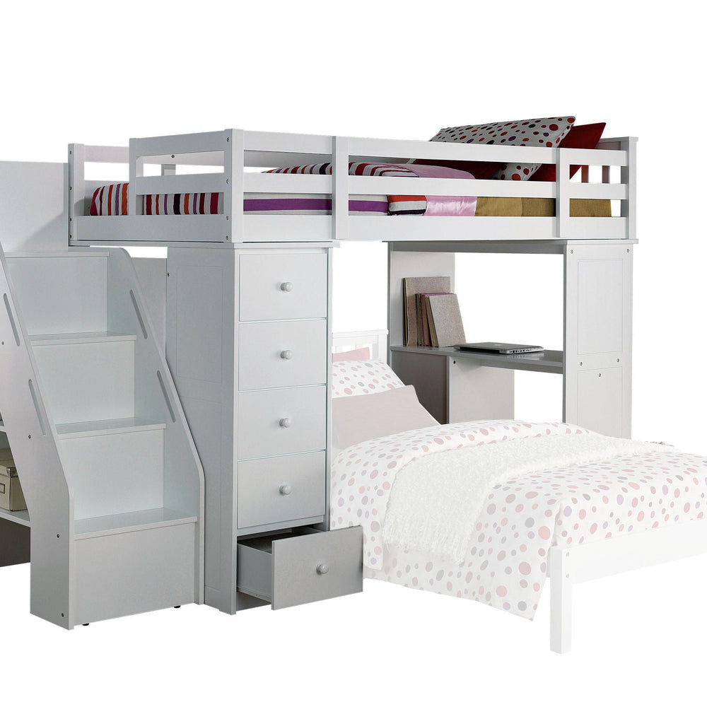 The Freya Twin Loft Bed is a multifunctional bedroom solution ideal for compact spaces, seamlessly combining sleeping, storage, and workspace in a sleek white finish that complements various decor styles.