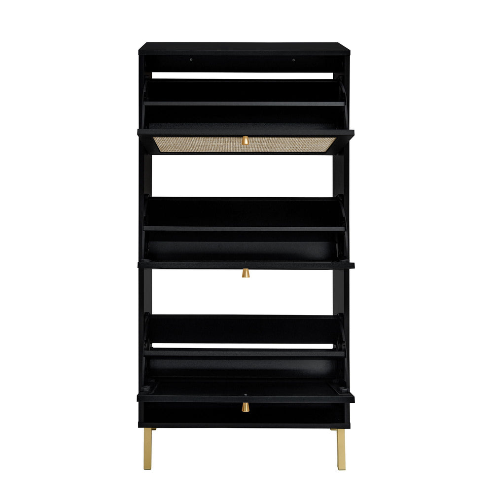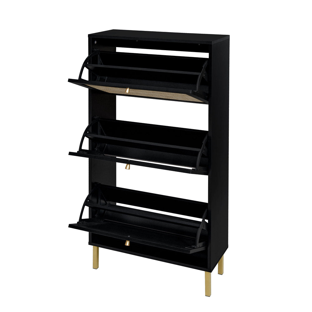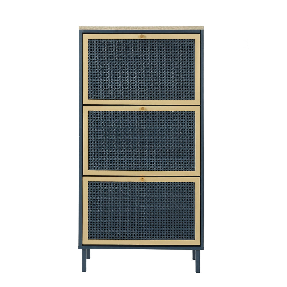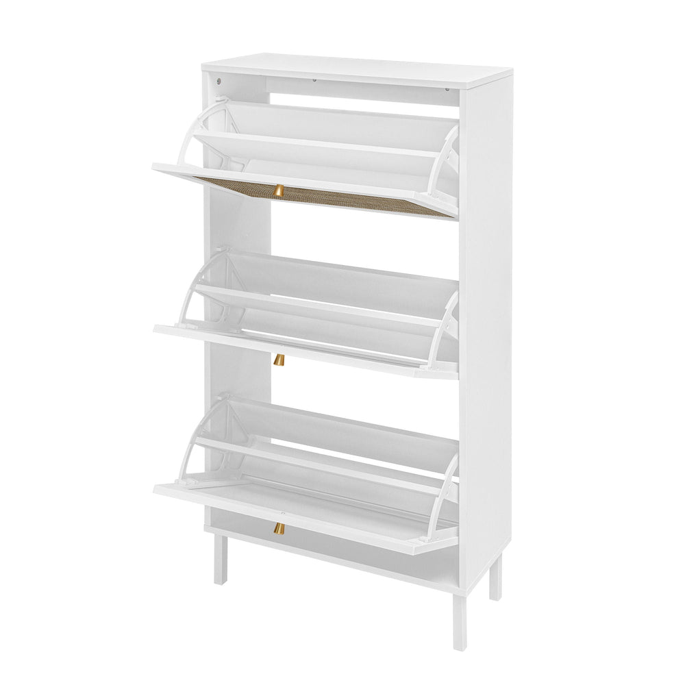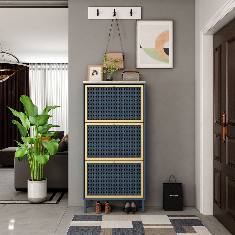 This modern shoe rack cabinet efficiently organizes footwear in your entryway while enhancing the space with a contemporary rattan and wood design featuring three doors.