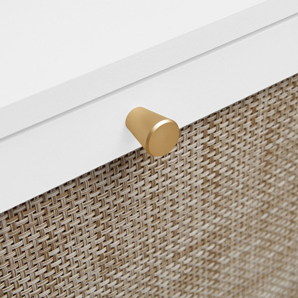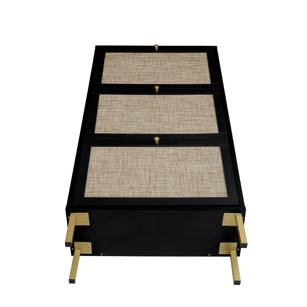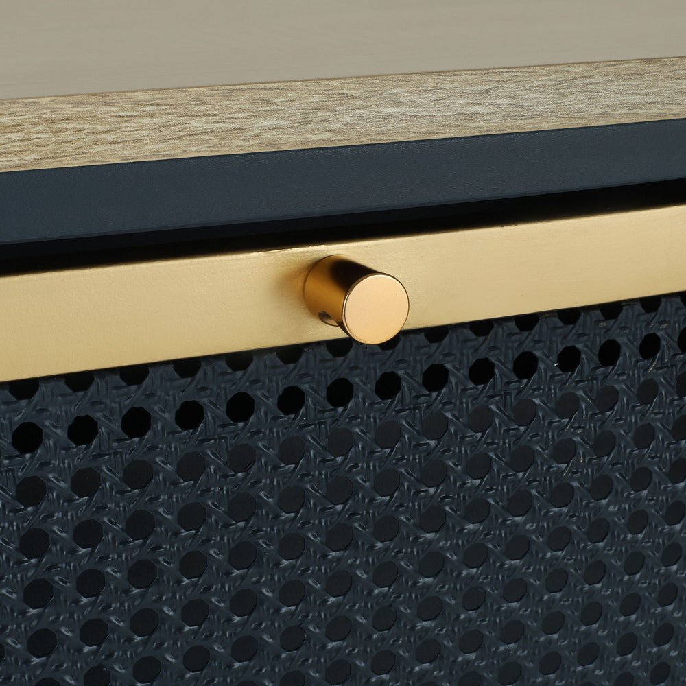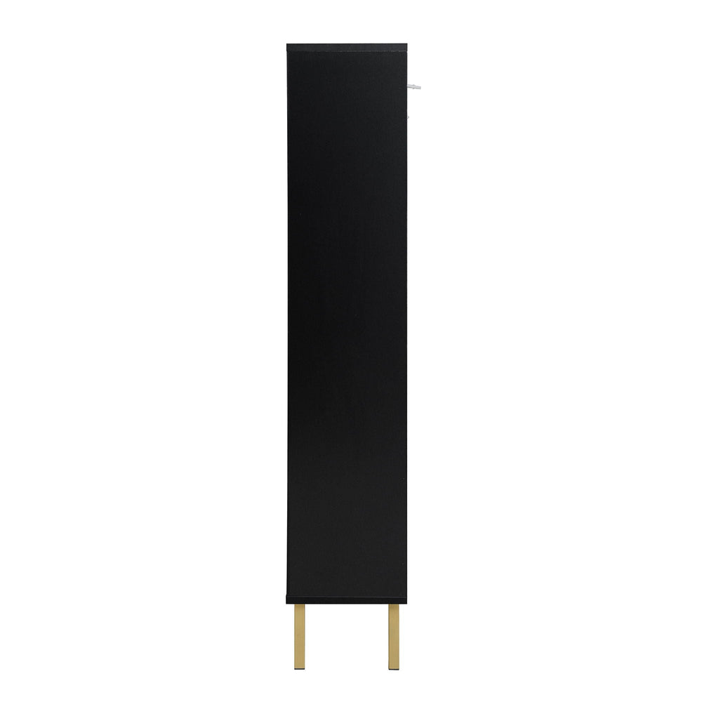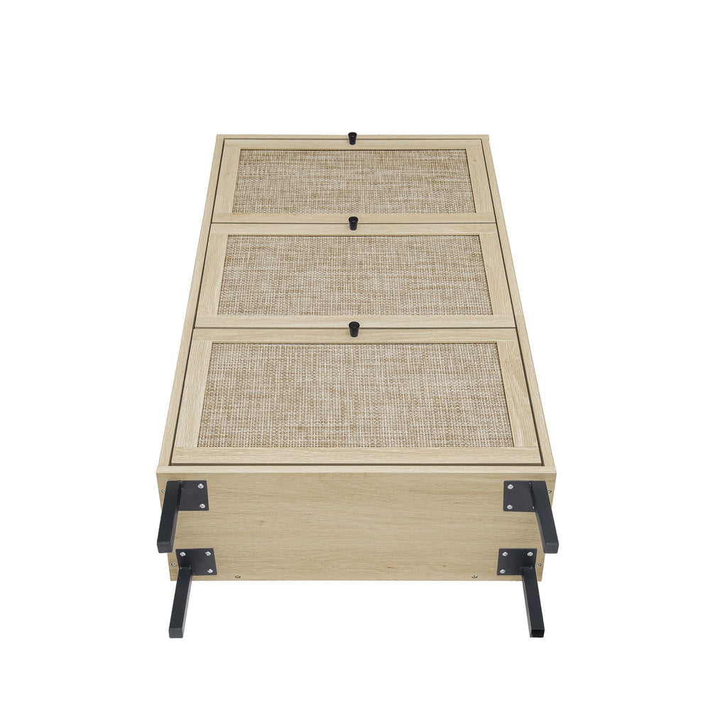 This modern shoe rack cabinet efficiently organizes footwear in your entryway while enhancing the space with a contemporary rattan and wood design featuring three doors.