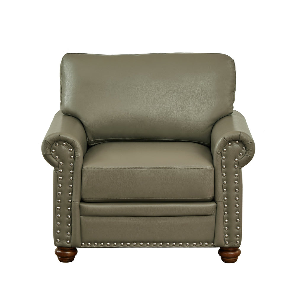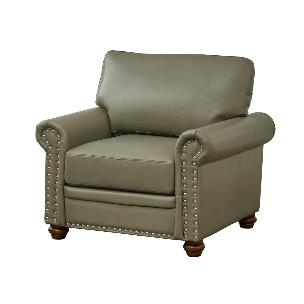 - Decorated with silver nailhead trim along the seat front and armrests for added elegance