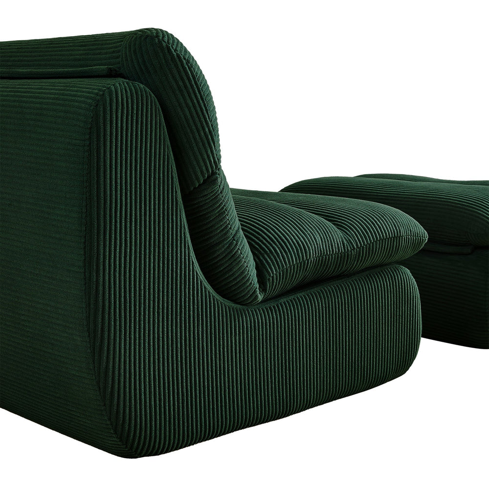 This modern lounge chair and ottoman set fits perfectly in living rooms or compact spaces, combining functional reclined seating with a versatile footrest or additional seat. The green corduroy upholstery adds a minimalist and sophisticated accent to contemporary interiors.