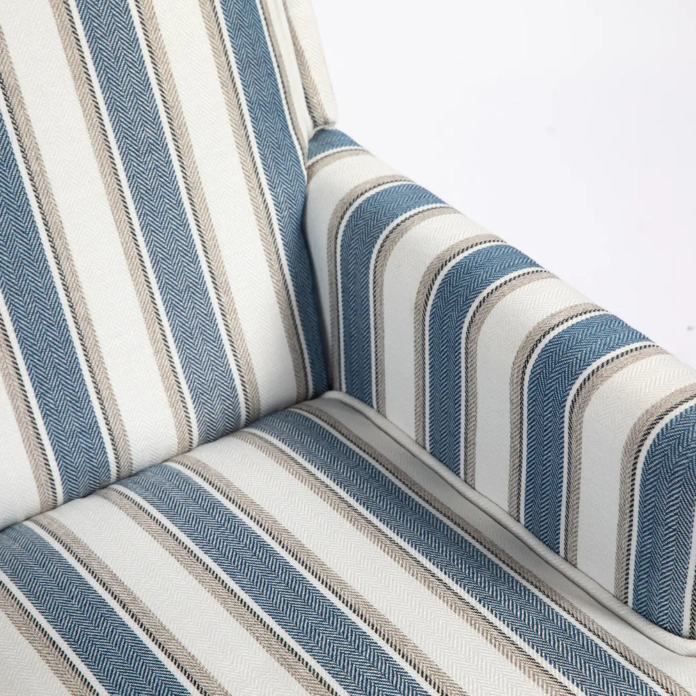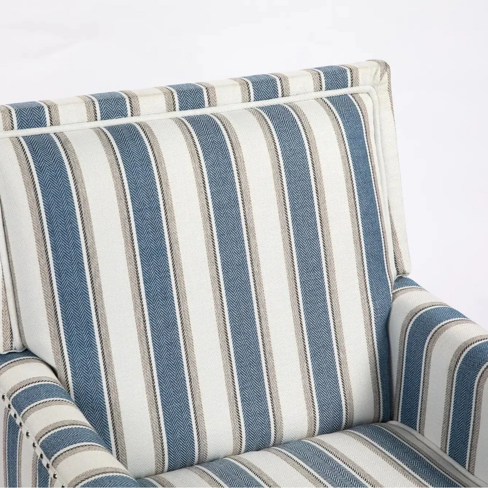 The upholstered accent chair features striped linen fabric and nailhead trim, making it a stylish and functional addition to living rooms, bedrooms, or offices. It combines classic design with comfort to enhance any seating area.