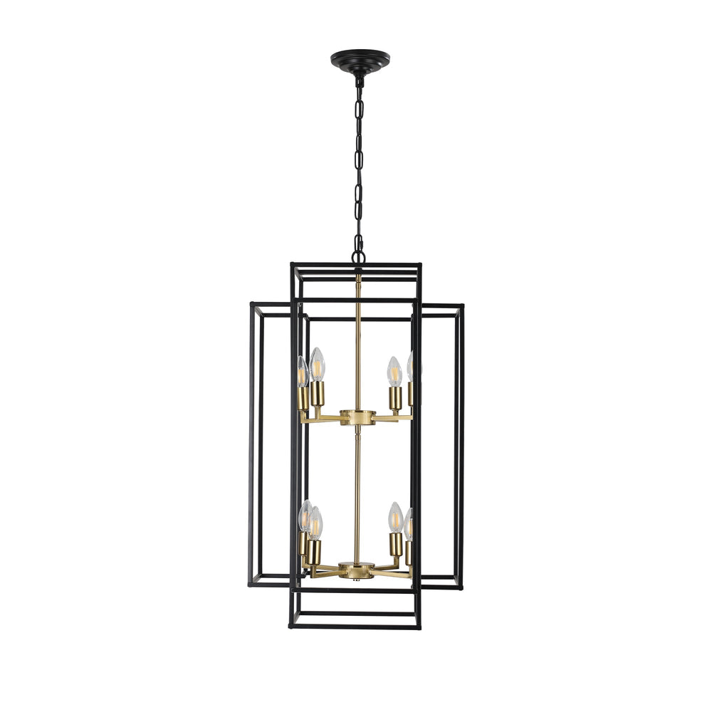 This 18' Modern 8-Light Pendant Chandelier features a black geometric metal frame with a gold central lamp base, perfect for stylish illumination in living rooms, dining rooms, kitchens, and foyers. Its adjustable hanging length allows for versatile installation to suit various interior settings.
