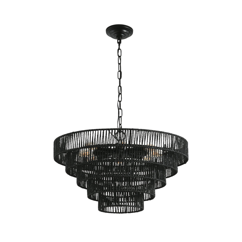 This 24' pendant light chandelier features a rustic, five-tier design with black hemp rope, ideal for adding warm, textured lighting to dining rooms, kitchens, or entryways. Its blend of industrial and farmhouse aesthetics complements various interior styles.