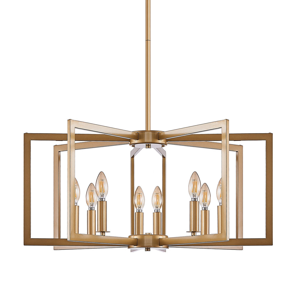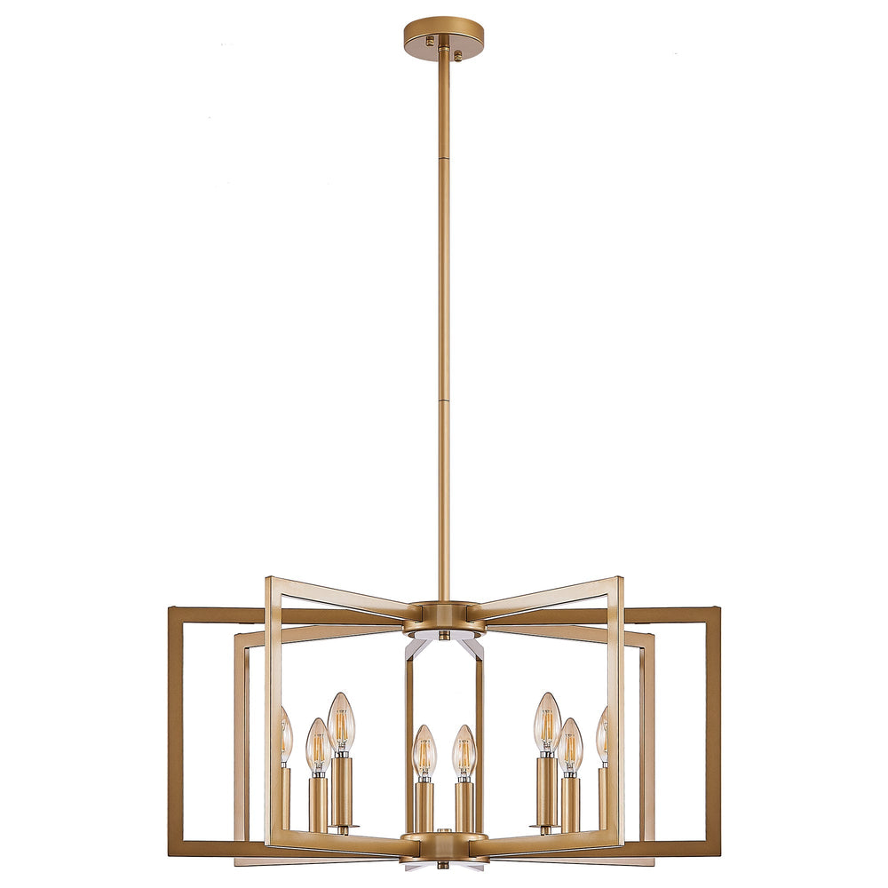 This 27-inch modern golden chandelier is an 8-light pendant fixture designed to complement living rooms, dining rooms, or kitchens with its blend of industrial metal construction and sleek geometric design.