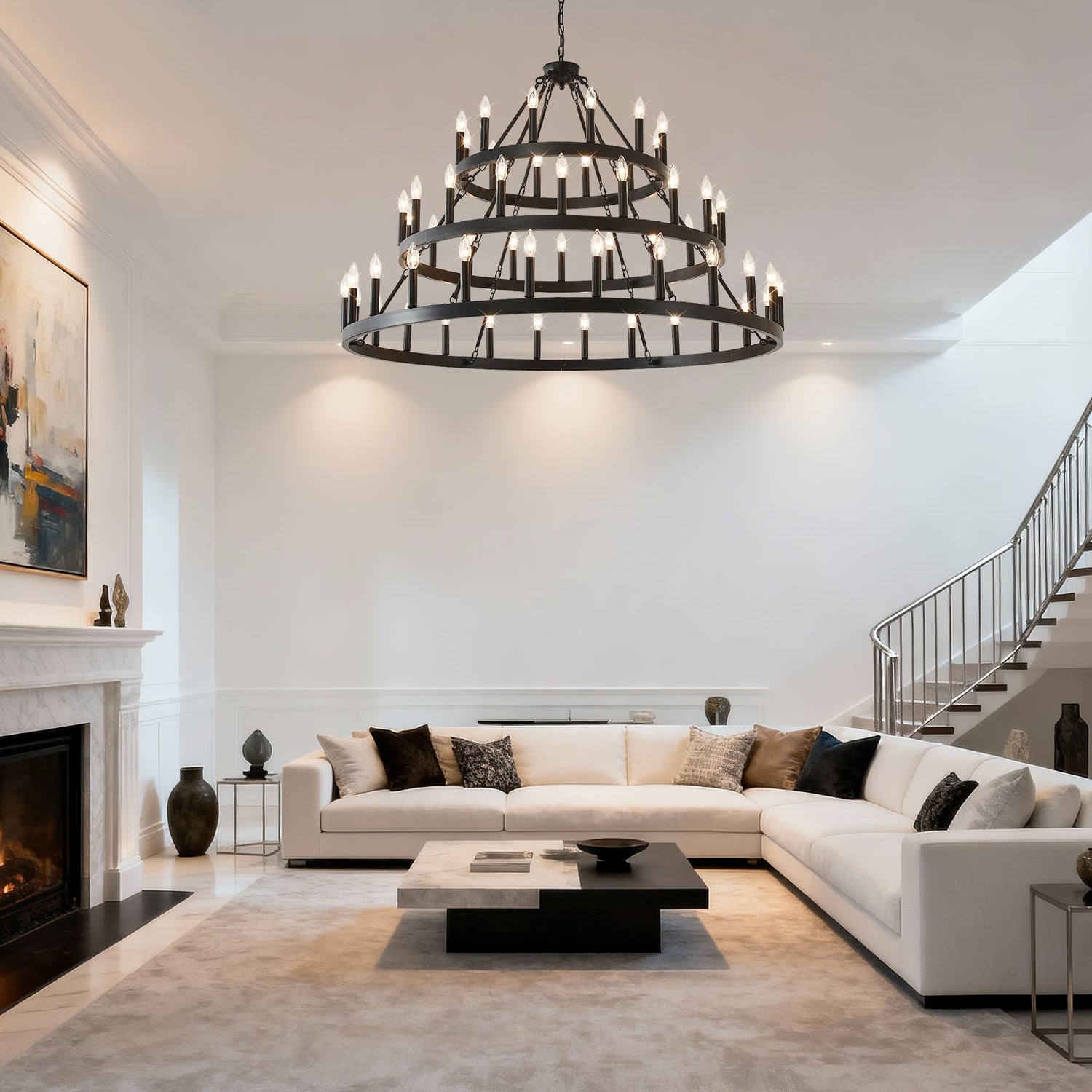 This large 3-tier wagon wheel chandelier features 54 lights and fits perfectly in living rooms, dining rooms, and foyers with high ceilings. Combining farmhouse charm with industrial style, it provides soft, ambient illumination and serves as a stunning focal point.