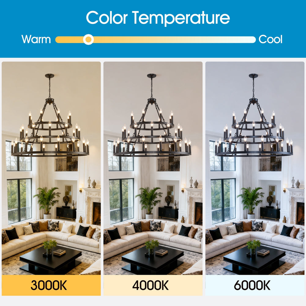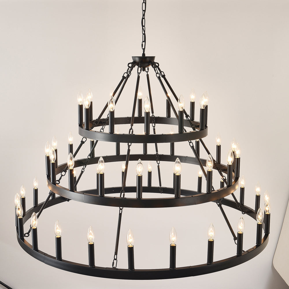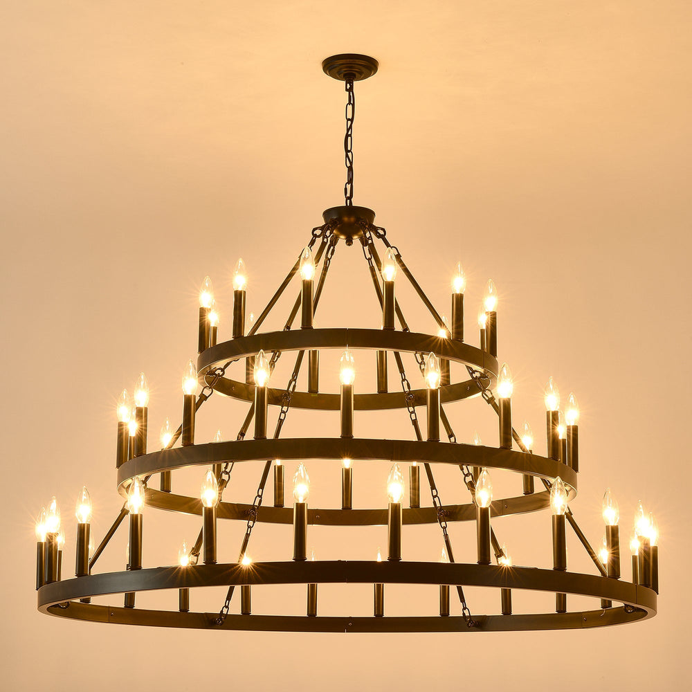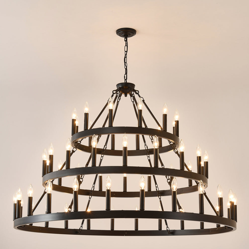 This large 39.37 inch wagon wheel chandelier features a three-tier design with 36 lights, ideal for living rooms, dining rooms, or foyers with high ceilings. It combines farmhouse rustic style with industrial metal construction to provide ambient illumination and visual appeal.