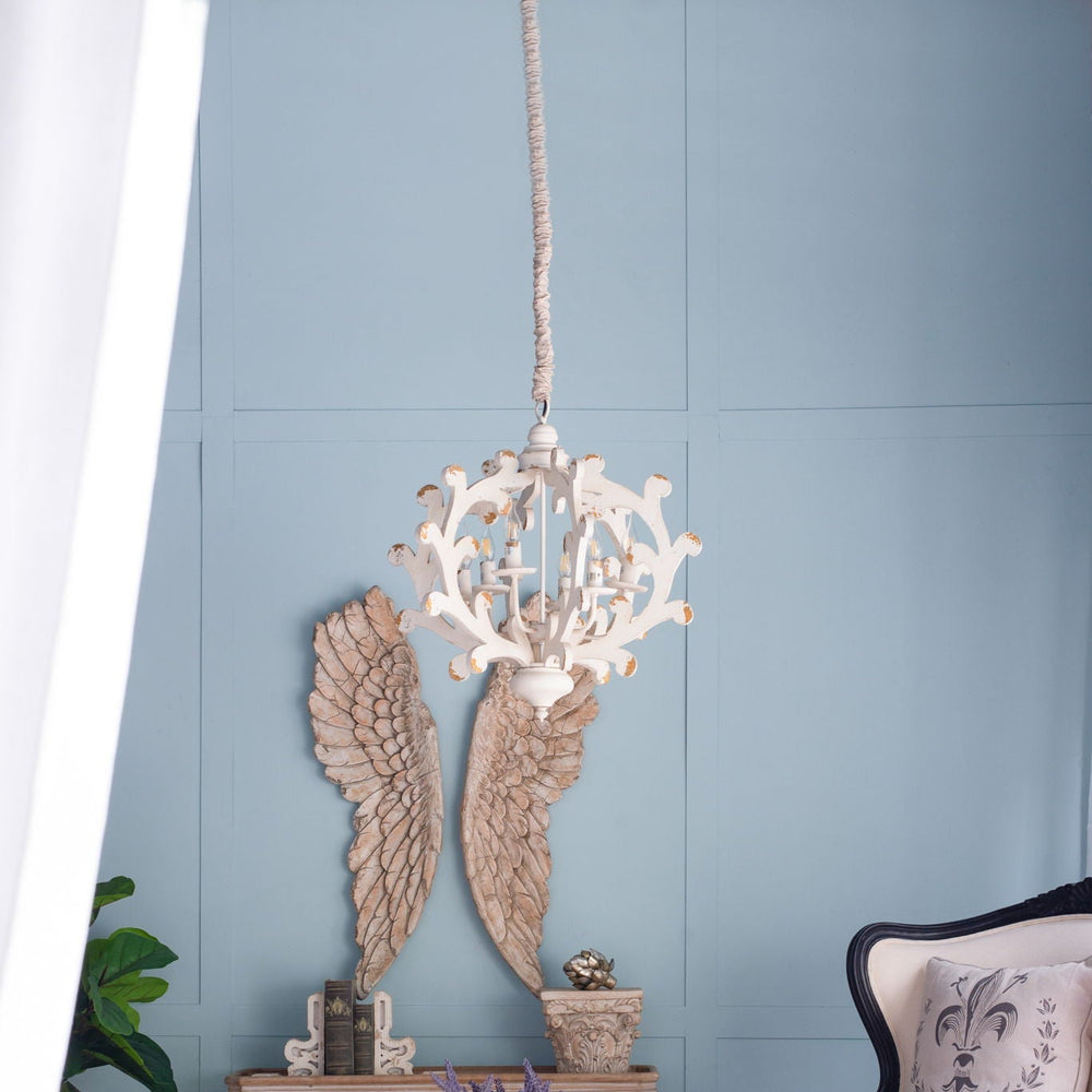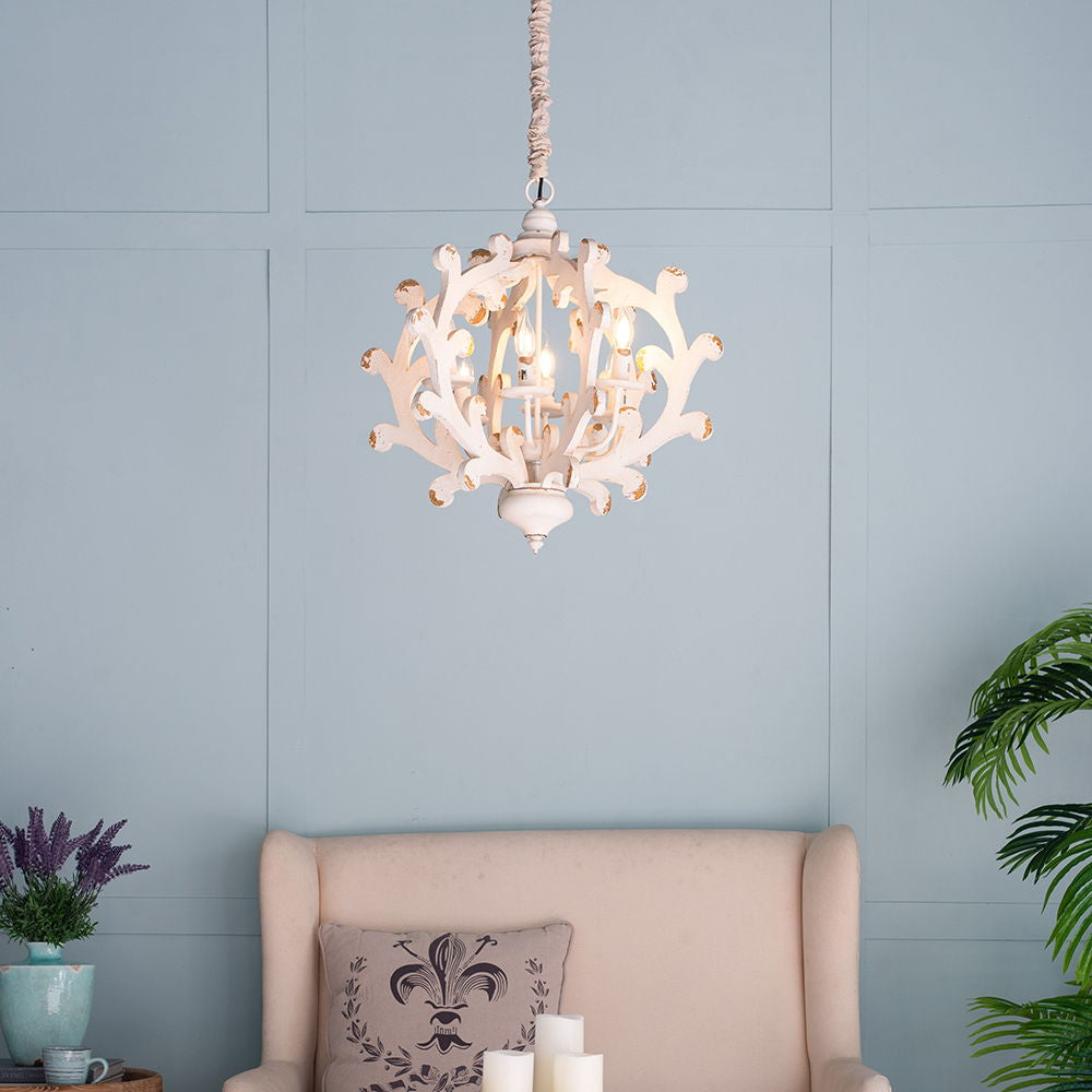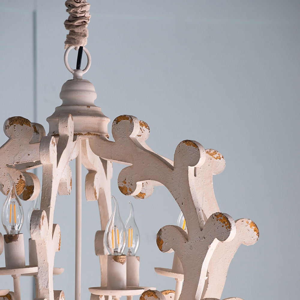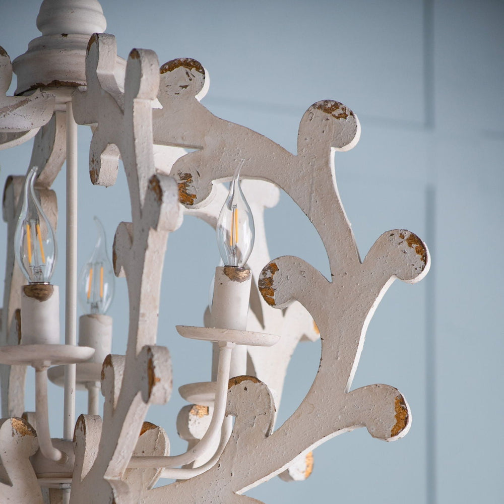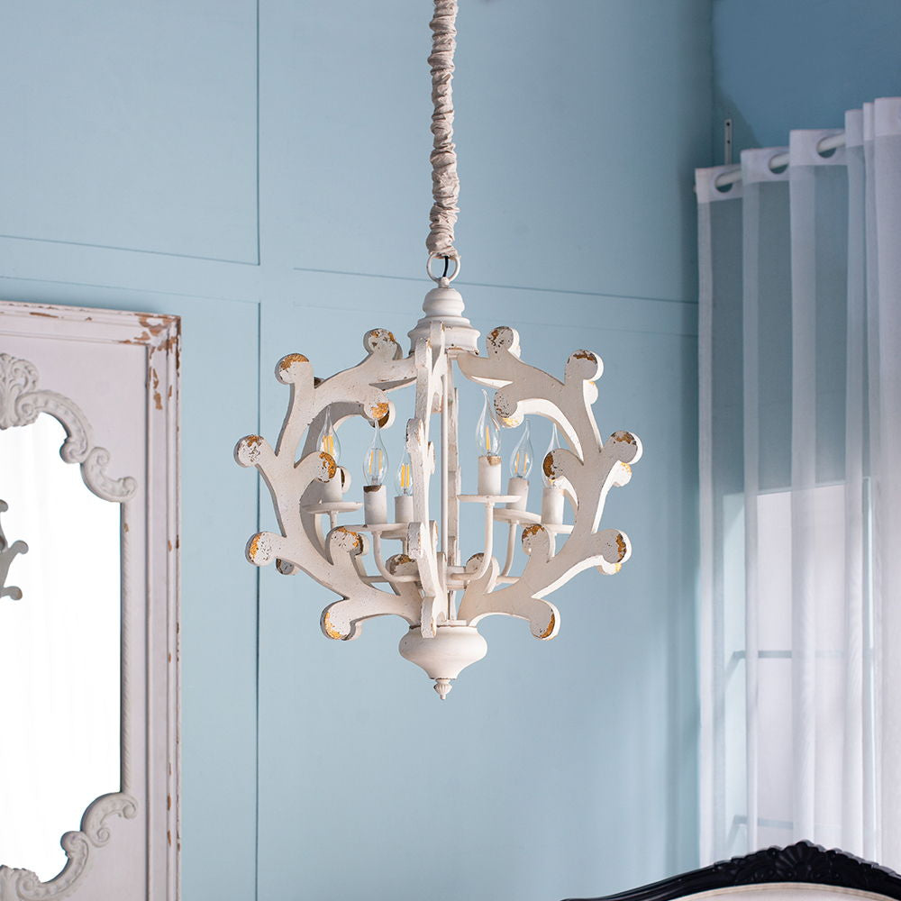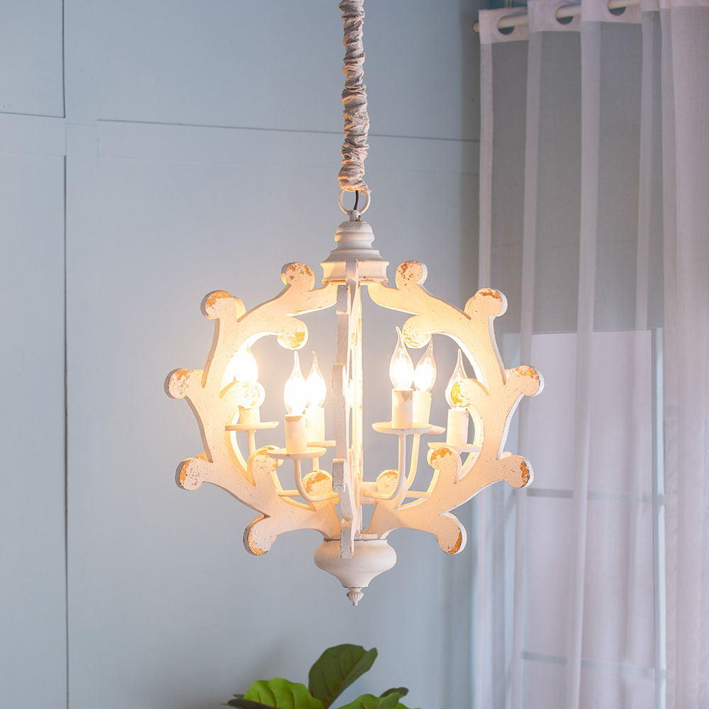 This 6 light chandelier combines durable MDF and iron materials with a white finish, perfect for enhancing kitchens, dining rooms, foyers, or entryways with versatile lighting and classic style.