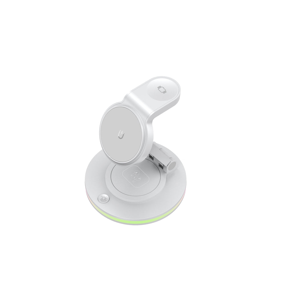 Designed for convenience, the foldable structure ensures easy portability, making it ideal for use at home, in the office, or while traveling. The built-in night light adds a touch of elegance, offering 7 adjustable colors to create a relaxing ambiance. Whether you're charging your devices bedside or on the go, this sleek and efficient 4-in-1 wireless station keeps your essentials powered up and organized.