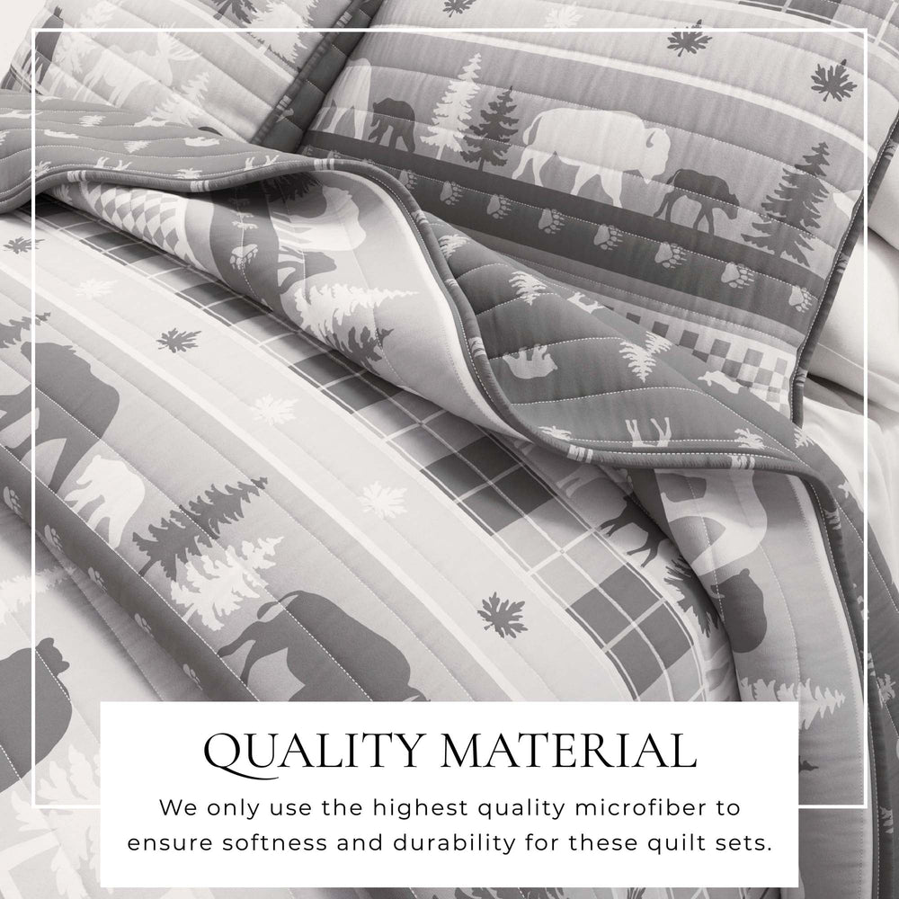 This charming lodge-themed quilt set adds a touch of the great outdoors to your bedroom. Featuring detailed prints of trees and woodland animals paired with complementary plaids, this reversible quilt set brings a rustic and cozy feel to any space. Crafted with attention to durability and an ease of machine-washability, this quilt set is perfect for families, guests, kids, and pets. Its lightweight warmth and versatile style ensure comfort throughout every season, making it an ideal addition to your home decor. Experience the cozy embrace of nature right in your bedroom.