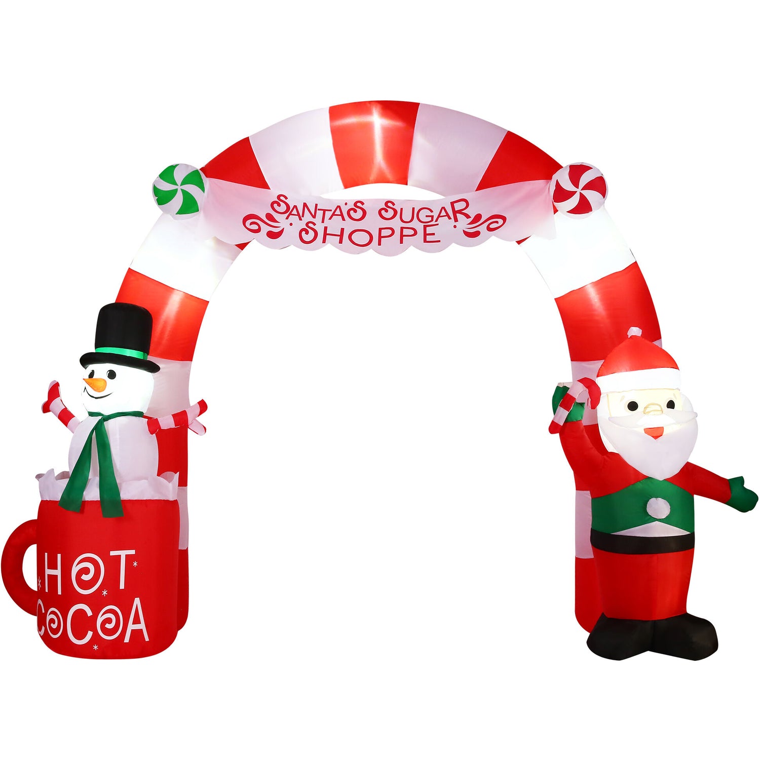 Celebrate Christmas in a big way this year with prelit jumbo inflatables by Fraser Hill Farm. Choose from our large assortment of festive airblown inflatables to create an unforgettable holiday scene. Brighten your lawn, garden, backyard, open porch, or deck day and night with this 9-ft. wide Pre-Lit Inflatable Candy Cane Arch, ready to spread some cheer. Inflate the magic of your seasonal light show, party display, or family celebration with this eye-catching decoration, certain to give your friends and family a warm welcome. You won't need to give directions. With this blow-up inflatable, your guests will easily find your home! Setup is quick and easy. Plus, everything you need is included in your package - air blower, ropes, and stakes. Unpack it, plug it in, stake it down, then enjoy as the fun unfolds. For unique props to celebrate the Holidays, count on quality products from Fraser Hill Farm.