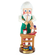 This Steinbach North Pole Santa Toymaker nutcracker is wearing red and white pants with a green shirt that is accented with a gold button near the shoulders. Santa is standing on a circular dark brown platform which also contains a small blue ball accented with white stars, a gold trumpet, and a light brown drum accented with a blue and yellow triangular pattern painted around the drum. Santa is working hard on his gifts on a light brown table, which holds a red paint can and a small rocking horse that Santa is in the process of painting with his wooden paintbrush that he holds in his left hand