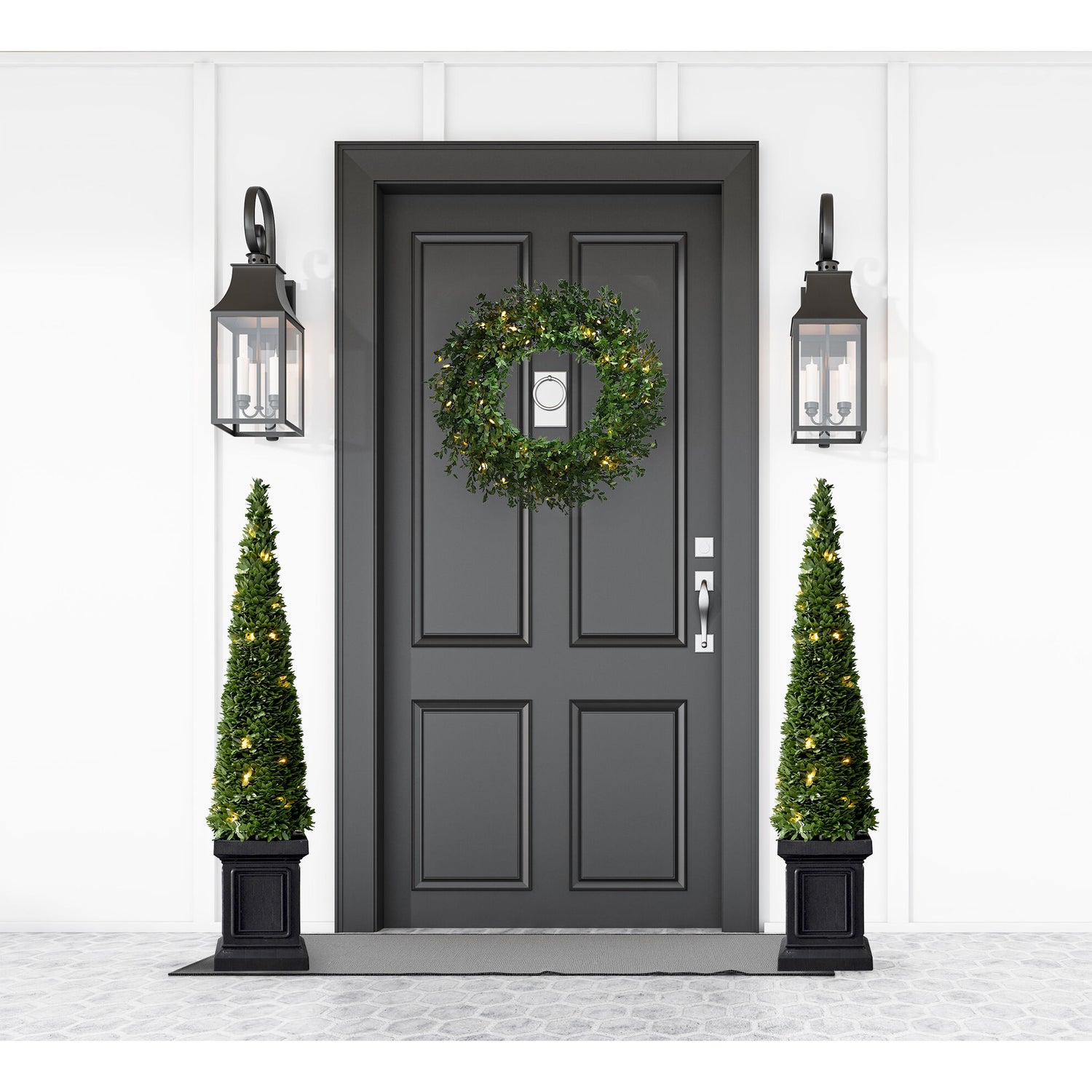 Make a statement with this 40-inch Boxwood topiary cone in a square pot from Fraser Hill Farm. Featuring lifelike foliage and all-metal structure for strength and durability, this modern topiary is specially crafted using the finest materials to look realistic and provide you with many seasons of use and enjoyment. The boxwood leaves are constructed from non-allergenic and flame-retardant materials then painted multiple hues of green so no two are exactly alike. Together these details create the look of a natural shrub that requires hardly any maintenance. Prestrung with 50 warm white LED lights, use this beautiful topiary as an alternative Christmas tree and decorate with ornaments, or keep it up year round as a funky accent piece. Place one in a corner for a lovely pop of green or buy two to frame a door, entryway, or fireplace. If you love a classic boxwood but do not want the maintenance, this is for you. Simply plug in and display - no clipping or watering required!
