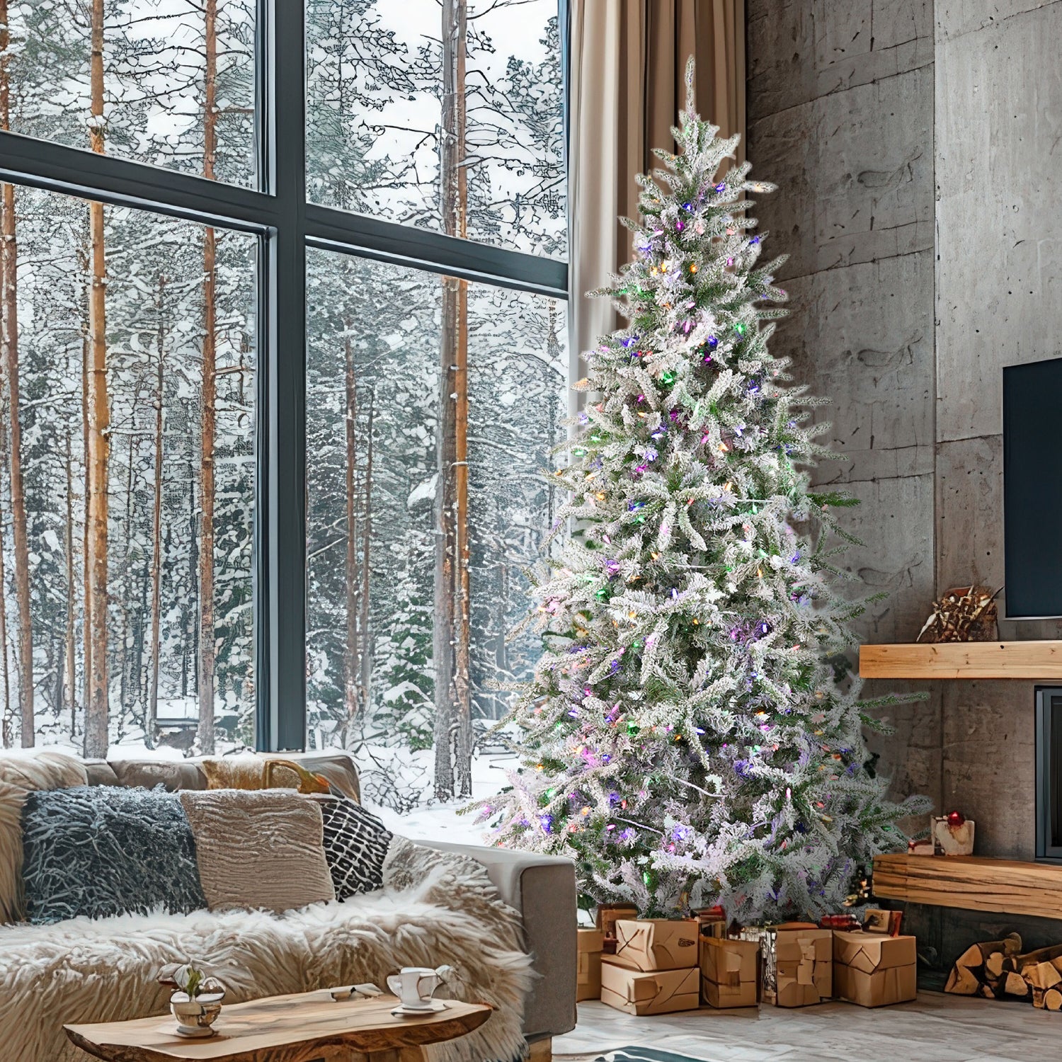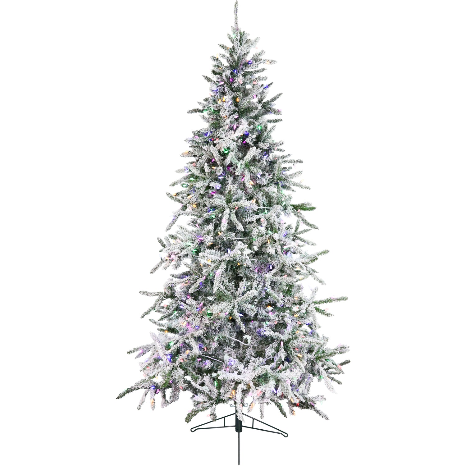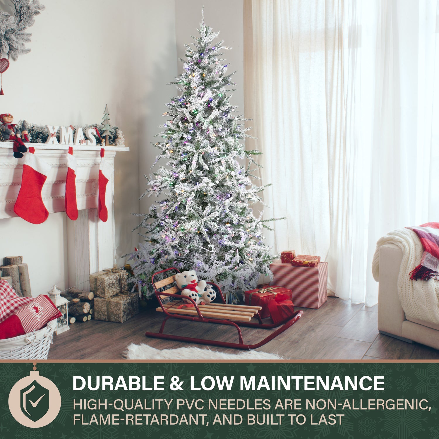 Celebrate the season in colorful style with the Fraser Hill Farm 9-Ft Mountain Pine Flocked Artificial Christmas Tree with Dual Multicolor LED Lights. Towering at 9 feet and blanketed in a realistic snowy finish, this beautifully crafted tree brings the wonder of a mountain landscape into your home. Its 1,818 lifelike branch tips create a lush, natural look, while pre-strung LED Christmas lights provide a joyful, festive glow that instantly brightens any space with nostalgic cheer. Say goodbye to the mess of a real tree; no fallen needles, watering, or tangled string lights required. The lights are evenly distributed and designed to shine brightly season after season, saving you time and effort every year. Setup is simple with the trees hinged branch design and sturdy metal stand, allowing you to focus on the joy of decorating. Built to last and made to impress, its sure to become the heart of your Christmas celebrations for many joyful years to come.