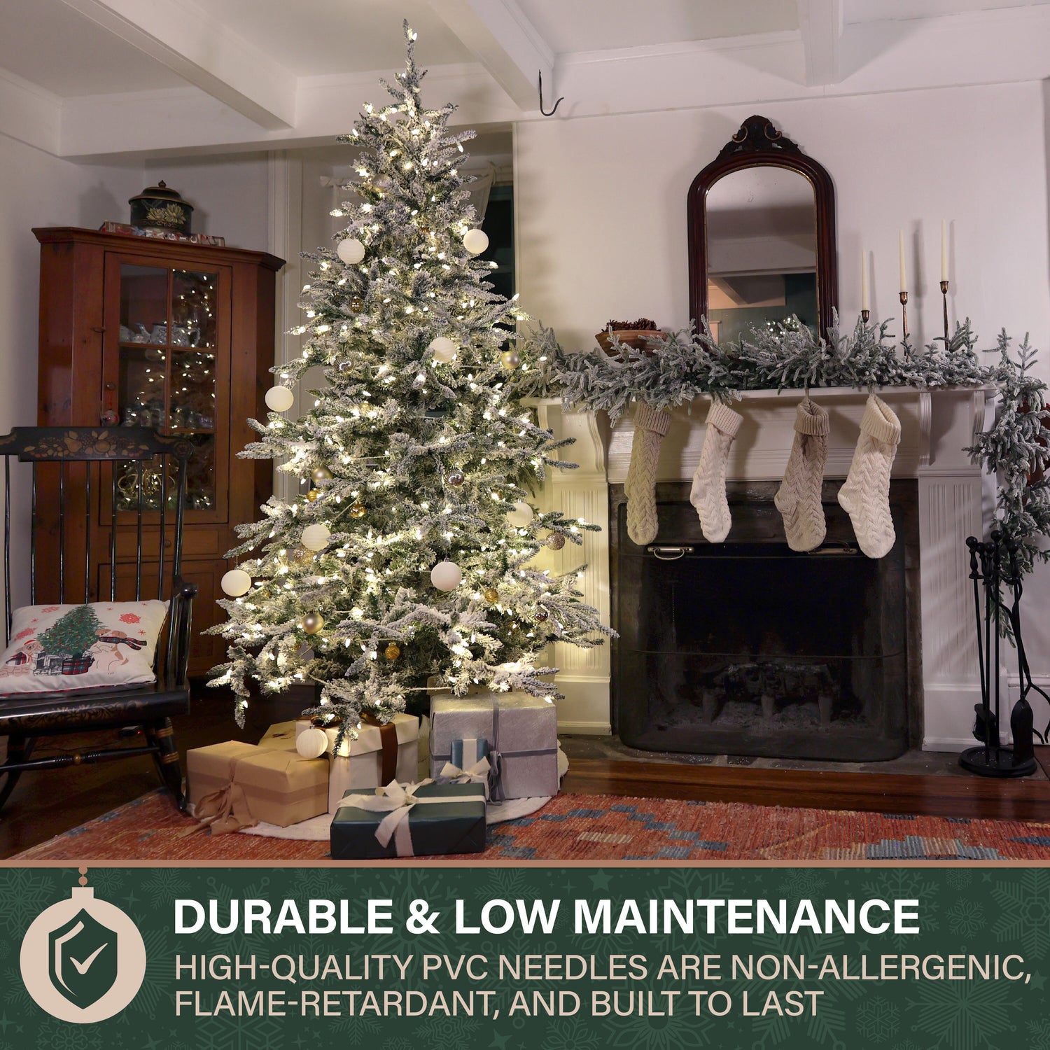 Celebrate the season in colorful style with the Fraser Hill Farm 9-Ft Mountain Pine Flocked Artificial Christmas Tree with Incandescent White Smart Lights. Towering at 9 feet and blanketed in a realistic snowy finish, this beautifully crafted tree brings the wonder of a mountain landscape into your home. Its 1,818 lifelike branch tips create a lush, natural look, while pre-strung smart lights provide a joyful, festive glow that instantly brightens any space with nostalgic cheer. Say goodbye to the mess of a real tree; no fallen needles, watering, or tangled string lights required. The lights are evenly distributed and designed to shine brightly season after season, saving you time and effort every year. Setup is simple with the trees hinged branch design and sturdy metal stand, allowing you to focus on the joy of decorating. Built to last and made to impress, its sure to become the heart of your Christmas celebrations for many joyful years to come.