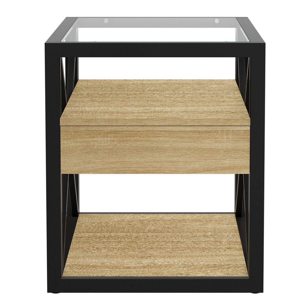 1 Piece Modern End Table with Drawer - Natural Wood & Tempered Glass