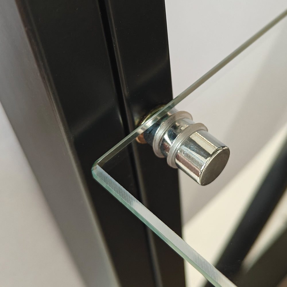 This modern end table nightstand combines tempered glass and rustic wood grain MDF to offer a stylish and functional addition to bedrooms, living rooms, or home offices. Its compact, industrial design complements various interiors while maximizing space efficiency.