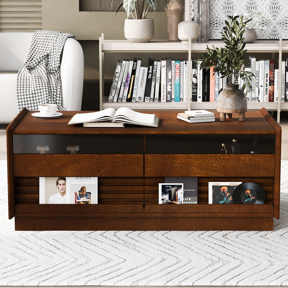 This modern rectangle coffee table features a refined vintage-style design that fits perfectly in living rooms blending classic and contemporary aesthetics. It offers both elegant style and practical storage for everyday use.