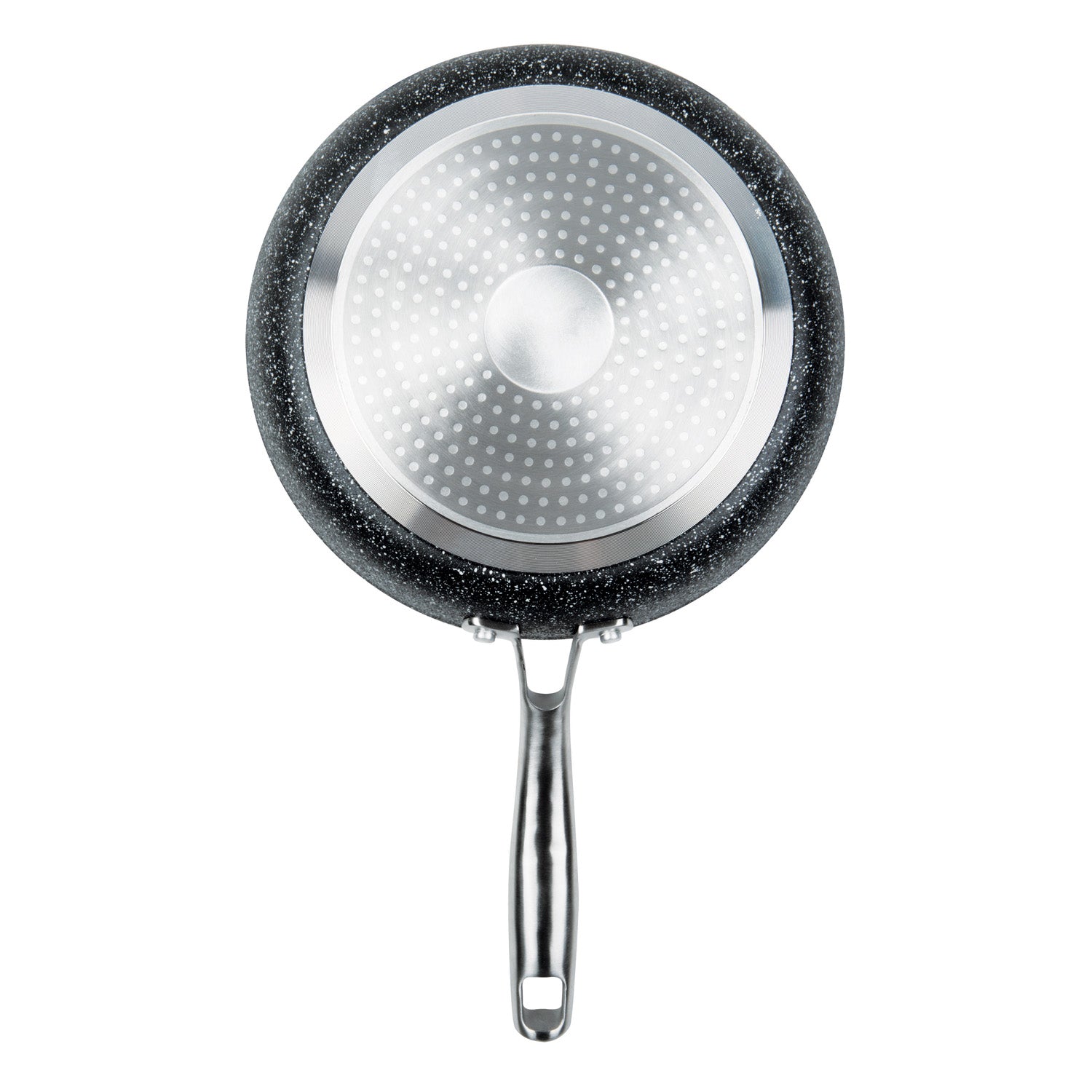 The MASTERPAN 9.5" Fry Pan & Skillet is made from quality cast aluminum with a premium sand blasted non-stick coating and stainless steel handle, and is ideal for making stir frys, crepes, pancakes, eggs, quesadillas, and much more. It has deep 2" sides that reduce spillage and splatter when frying. Its double layer, ultra nonstick coating will last longer then your conventional non-stick cookware and is PFOA, lead, cadmium, and heavy metal free, making it safe and durable for daily use and incredibly easy to clean. The sleek style and ultra durability fulfills all your cooking desires. The heavy gauge base allows it to be used safely on any heat source including induction, and is designed to distribute heat evenly throughout the pan for amazing results even when searing foods. The sturdy and ergonomic stainless steel handle allows this pan to be dishwasher safe. As part of our Granite Series, the pan boasts a streamlined black-grey granite stone look inside and out making it an ideal addition to your cooking needs. Cookware that is guaranteed to perform as amazing as it looks!