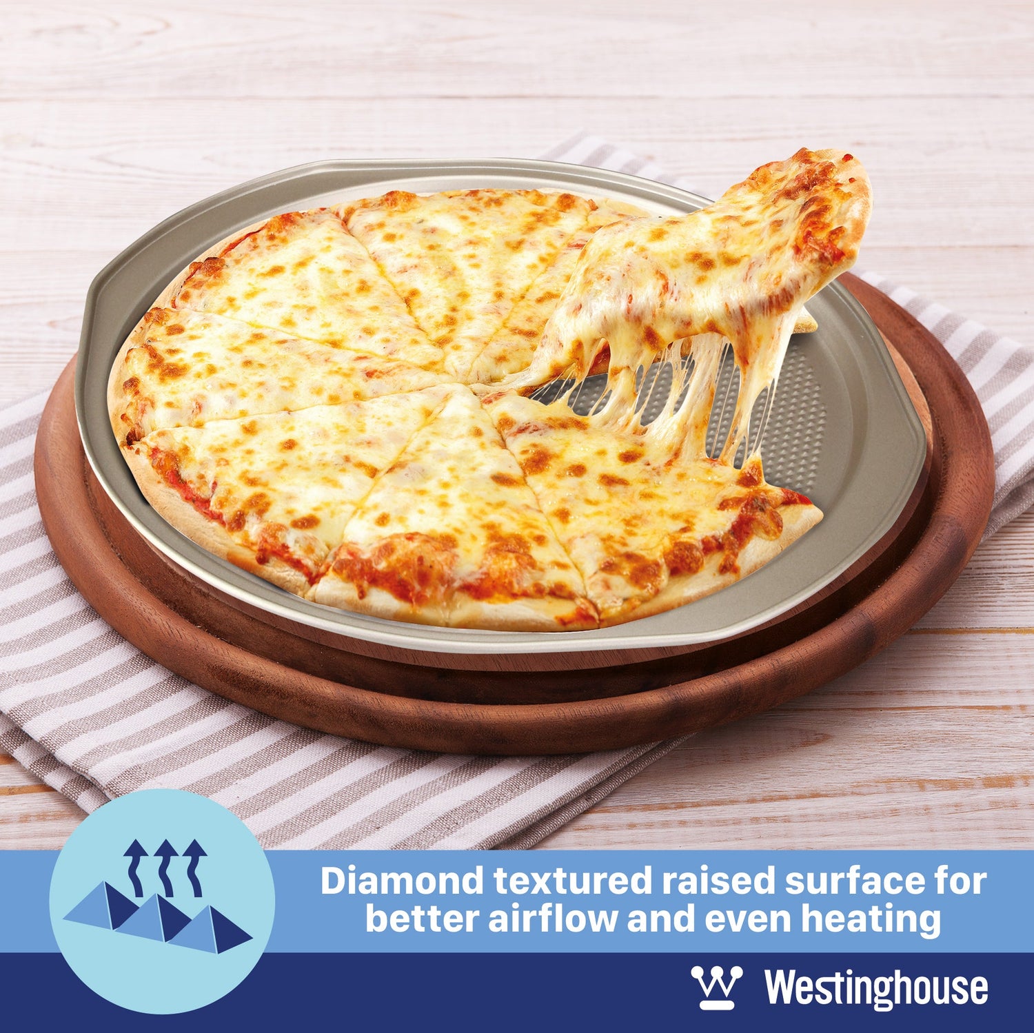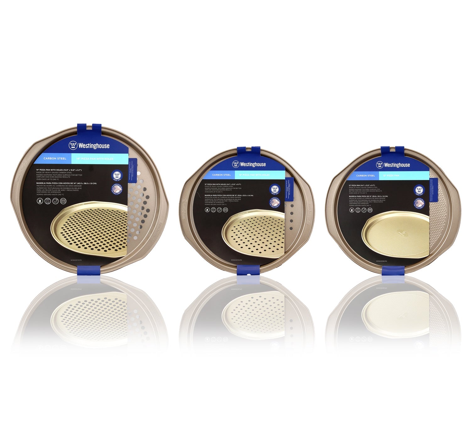 The WESTINGHOUSE versatile bakeware set is the newest addition to our cookware line. This 3-pc nonstick bakeware set will help you bake without any fuss. Its made from 0.8mm heavy duty carbon steel that is designed not to warp or bend out of shape. The textured finish allows for a well balanced heat ensuring amazing baking results every time. Bake amazing pizzas, calzones, apple tartans, croissants, etc. The superior non-stick coating makes for an easy clean up.
