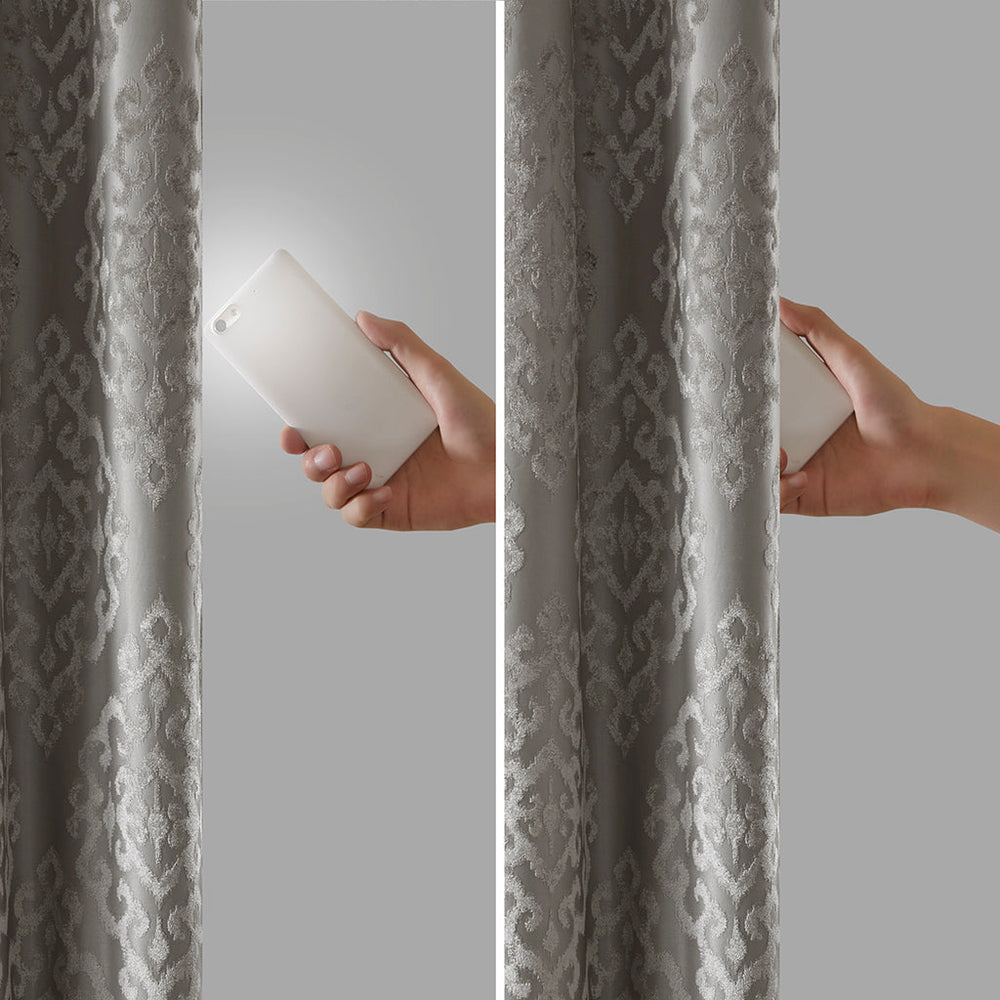 This charcoal blackout curtain panel with a knitted jacquard damask design is perfect for bedrooms, media rooms, or any space needing privacy and light control. It combines elegant style with functional benefits.