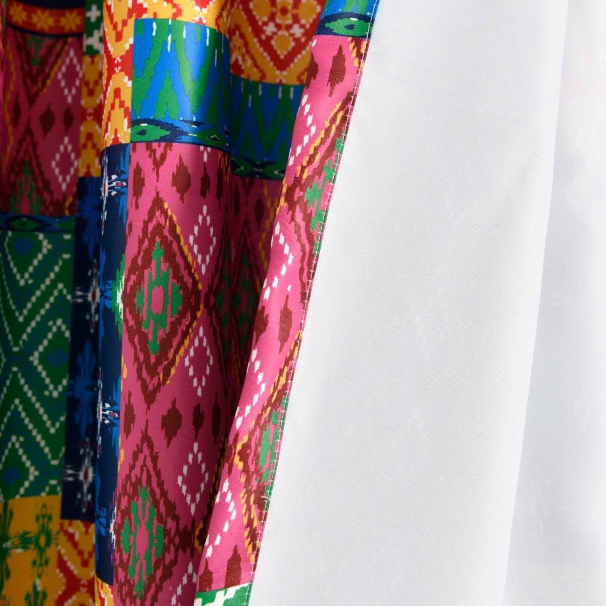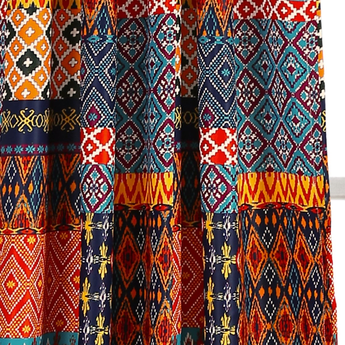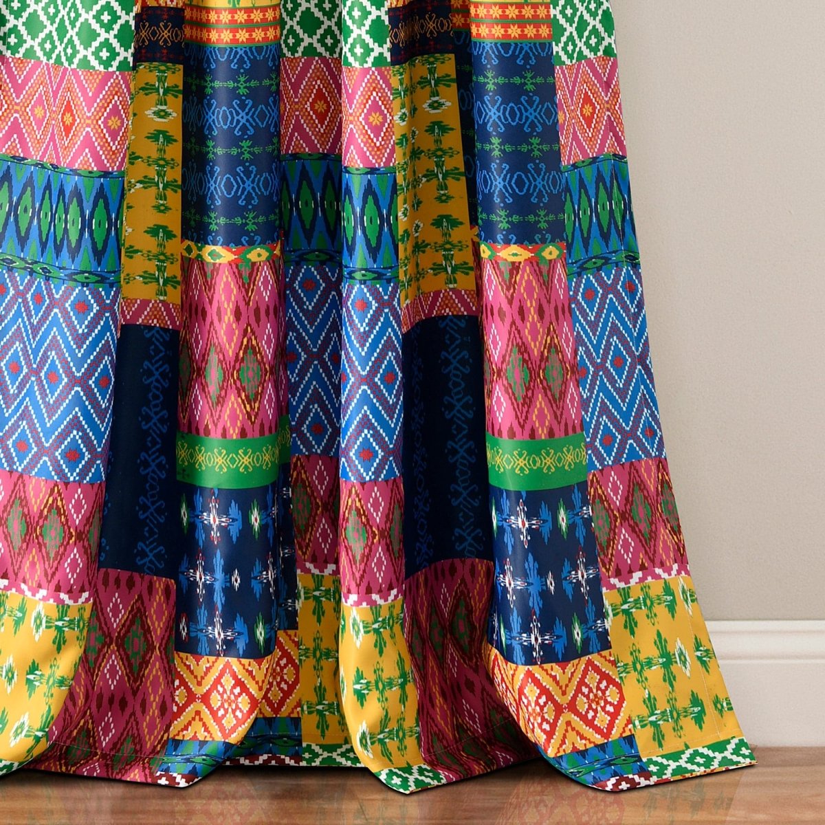 The Misha Light Filtering Window Curtain Set takes patchwork style to a whole new level. Bright and bold colors make these curtains a statement piece in any room. Each section of the patchwork includes a geometric pattern.