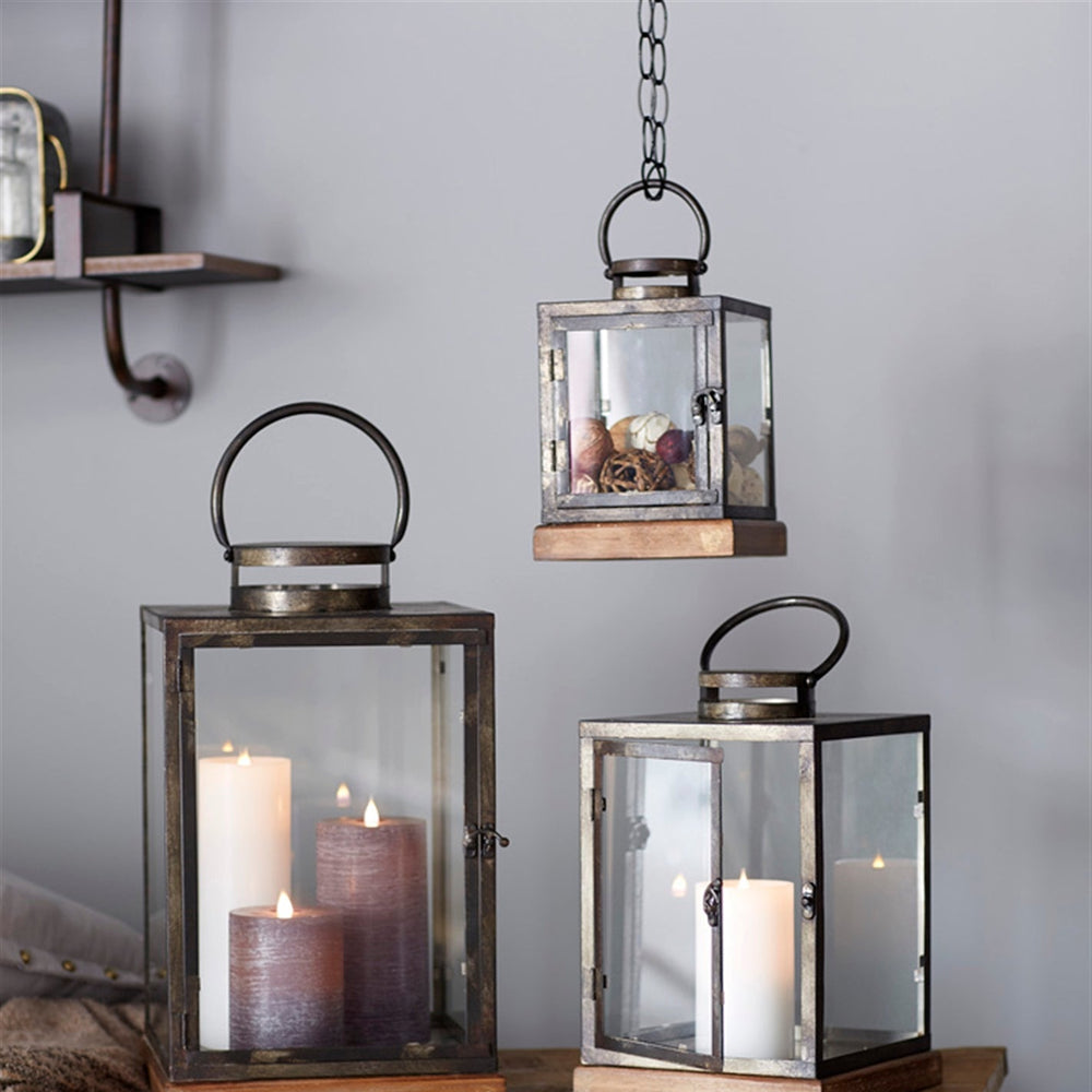 This set of 3 metal box lanterns with wood bases is designed for indoor use, adding a cozy and rustic touch to farmhouse-themed living spaces, mantels, shelves, or tables.