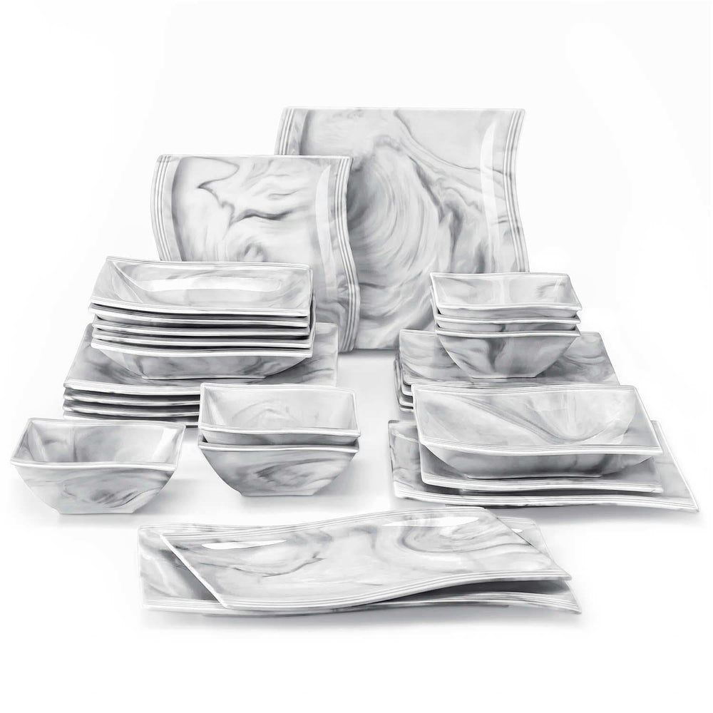 The Flora 26-Piece Set blends elegance and functionality, crafted from premium porcelain in ivory white or marble-inspired grey, blue, and pink. Its square wavy shape and geometric design create a sleek, modern aesthetic. Serving six, the set includes dinner plates, salad plates, soup plates, cereal bowls, and two versatile serving dishes. Durable and stackable for easy storage, it’s microwave, oven, and dishwasher safe. Inspired by blooming flowers, Flora brings a fresh, contemporary touch to everyday meals or special occasions.