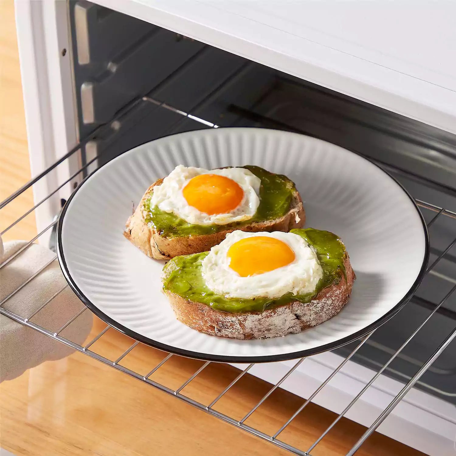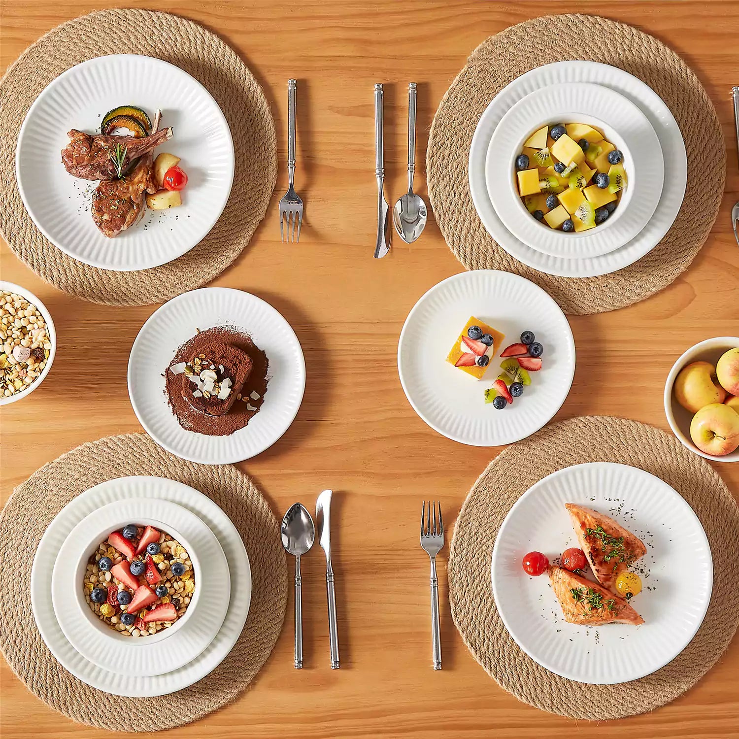 Our Leila collection pairs a refined glaze with softly sculpted ribbing, balancing simplicity with classical detail. The gentle relief adds texture and a pleasing hand feel, while the reinforced rim ensures stability in daily use. With stackable bases, the pieces store neatly. Available in classic ivory white or accented with a fine black rim, the set offers two timeless looks to suit different tables. This four-person set includes dinner plates, dessert plates, and bowls—everyday essentials that are versatile, durable, and easy to use. Made of fine porcelain, the set is safe for both microwave and dishwasher.
