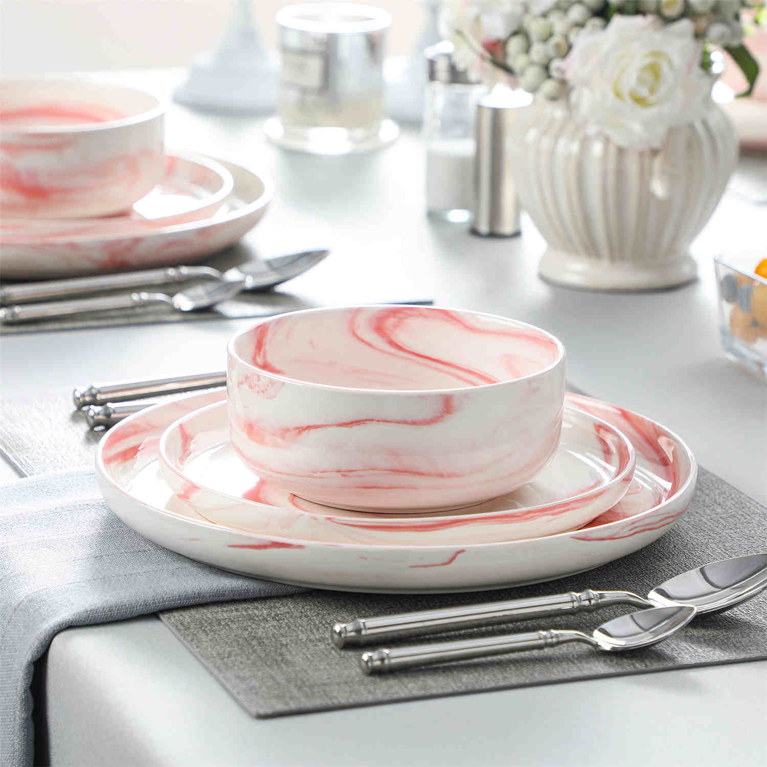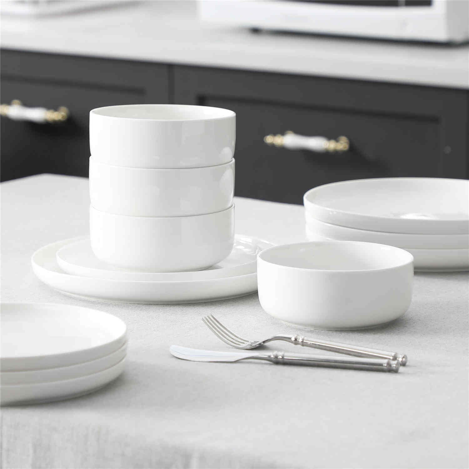 Step into modern sophistication with this coveted dinnerware set, defined by its sleek lipped design. This refined collection features dinner plates, dessert plates, and cereal bowls, all crafted from durable reinforced porcelain. Available in a versatile palette, from classic ivory white with black trim to marble grey, blue, and pink, this set for four effortlessly combines contemporary style with timeless allure. Designed for everyday use, each piece is dishwasher, microwave, and oven safe, offering both practicality and refined aesthetics.