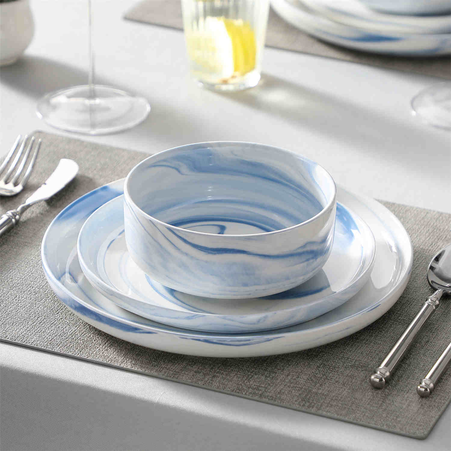 The Luna 18-Piece Set blends elegance and practicality, inspired by the moon’s serene beauty. Available in ivory white, ivory with black trim, or marble designs in pink, blue, and gray, this set serves six with dinner plates, salad plates, and cereal bowls. The lipped-edge design adds modern refinement, while the stackable, space-saving form suits contemporary homes. Made from durable, non-porous porcelain, it resists odors and is microwave, oven, and dishwasher safe, bringing timeless charm to every meal.