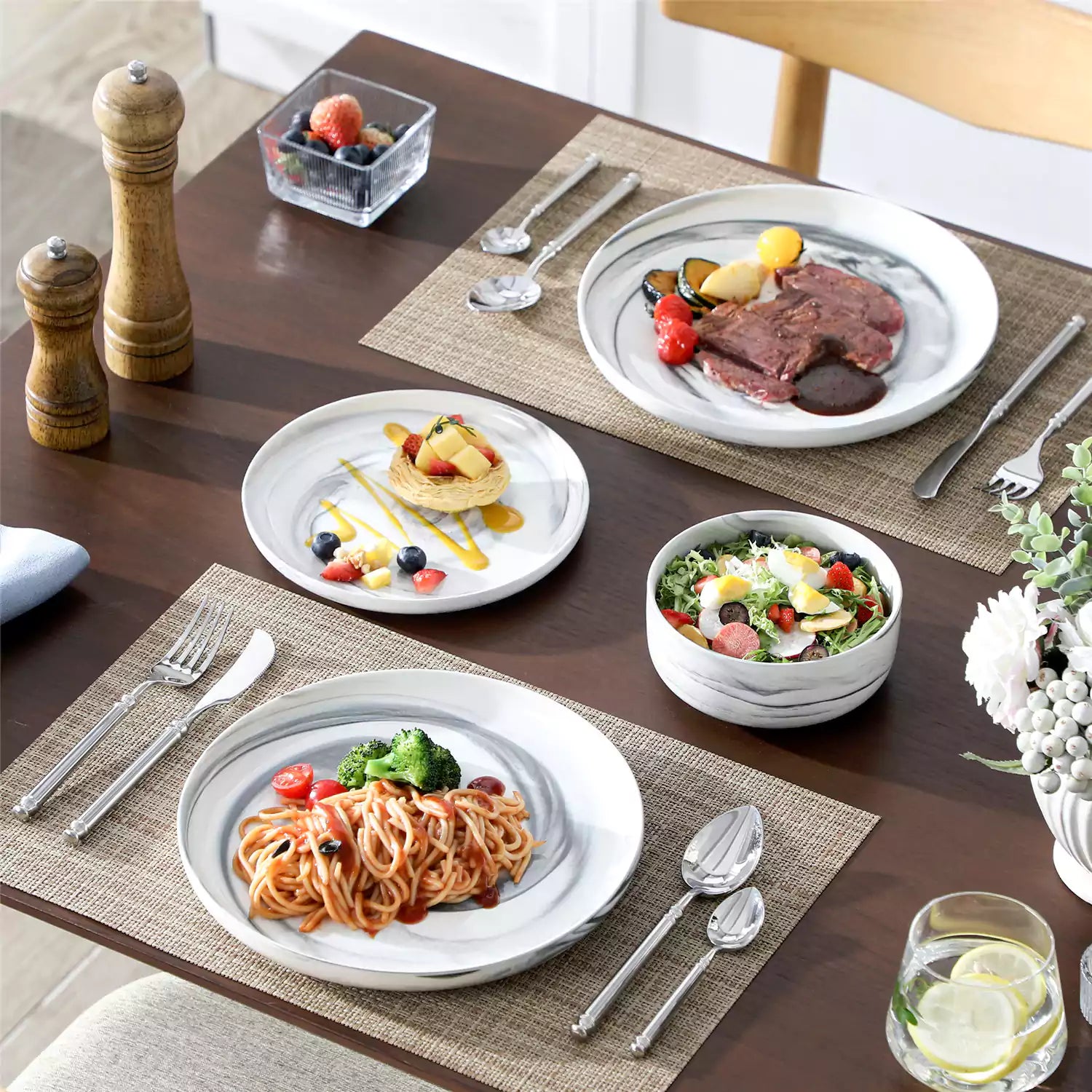 Step into modern sophistication with this coveted dinnerware set, defined by its sleek lipped design and offered in a refined palette—classic ivory white, elegant black-trimmed ivory, and marbled hues of grey, blue, and pink. This durable porcelain collection for eight includes dinner plates, dessert plates, and cereal bowls. Dishwasher, microwave, and oven safe, it blends contemporary style with timeless practicality for everyday use.