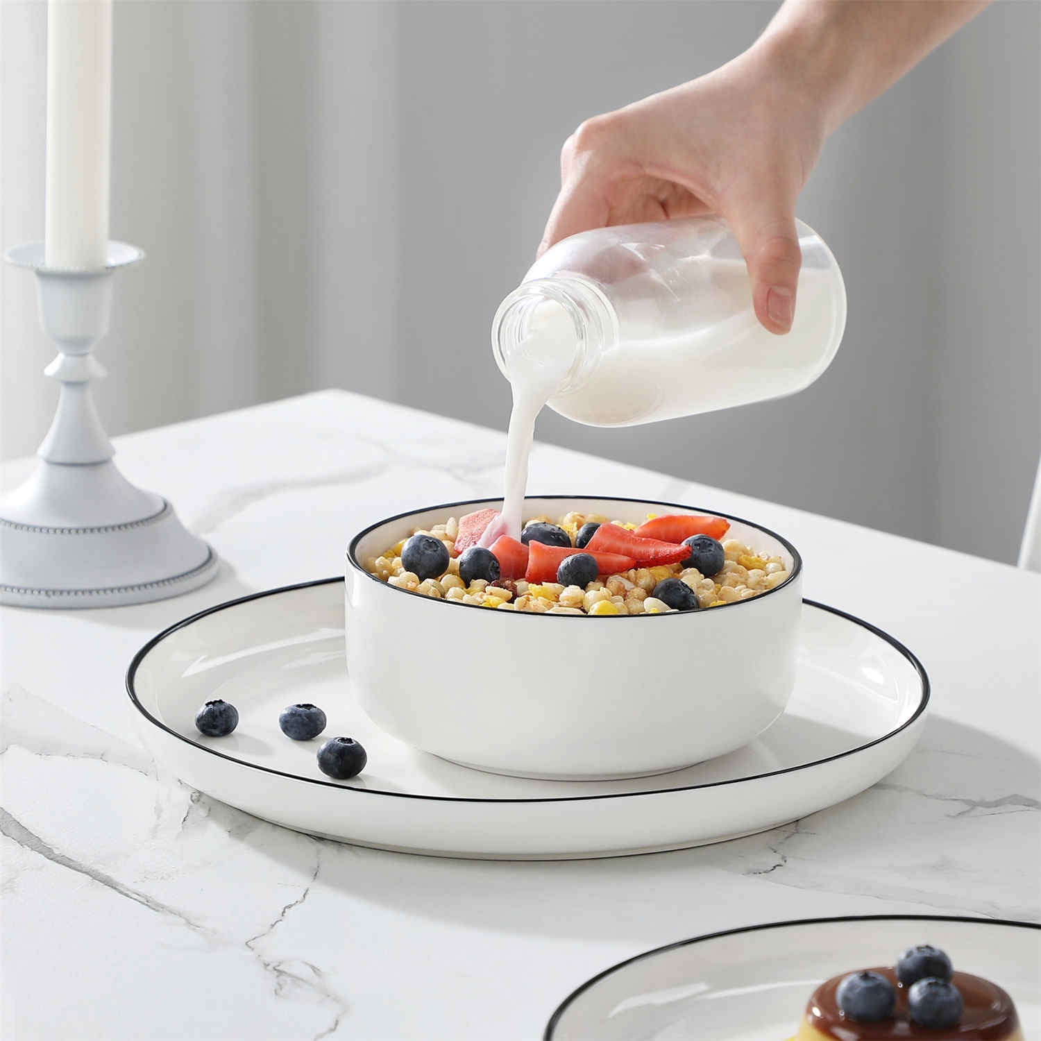 Step into modern sophistication with this coveted dinnerware set, defined by its sleek lipped design. This refined collection features dinner plates, dessert plates, and cereal bowls, all crafted from durable reinforced porcelain. Available in a versatile palette, from classic ivory white with black trim to marble grey, blue, and pink, this set for four effortlessly combines contemporary style with timeless allure. Designed for everyday use, each piece is dishwasher, microwave, and oven safe, offering both practicality and refined aesthetics.