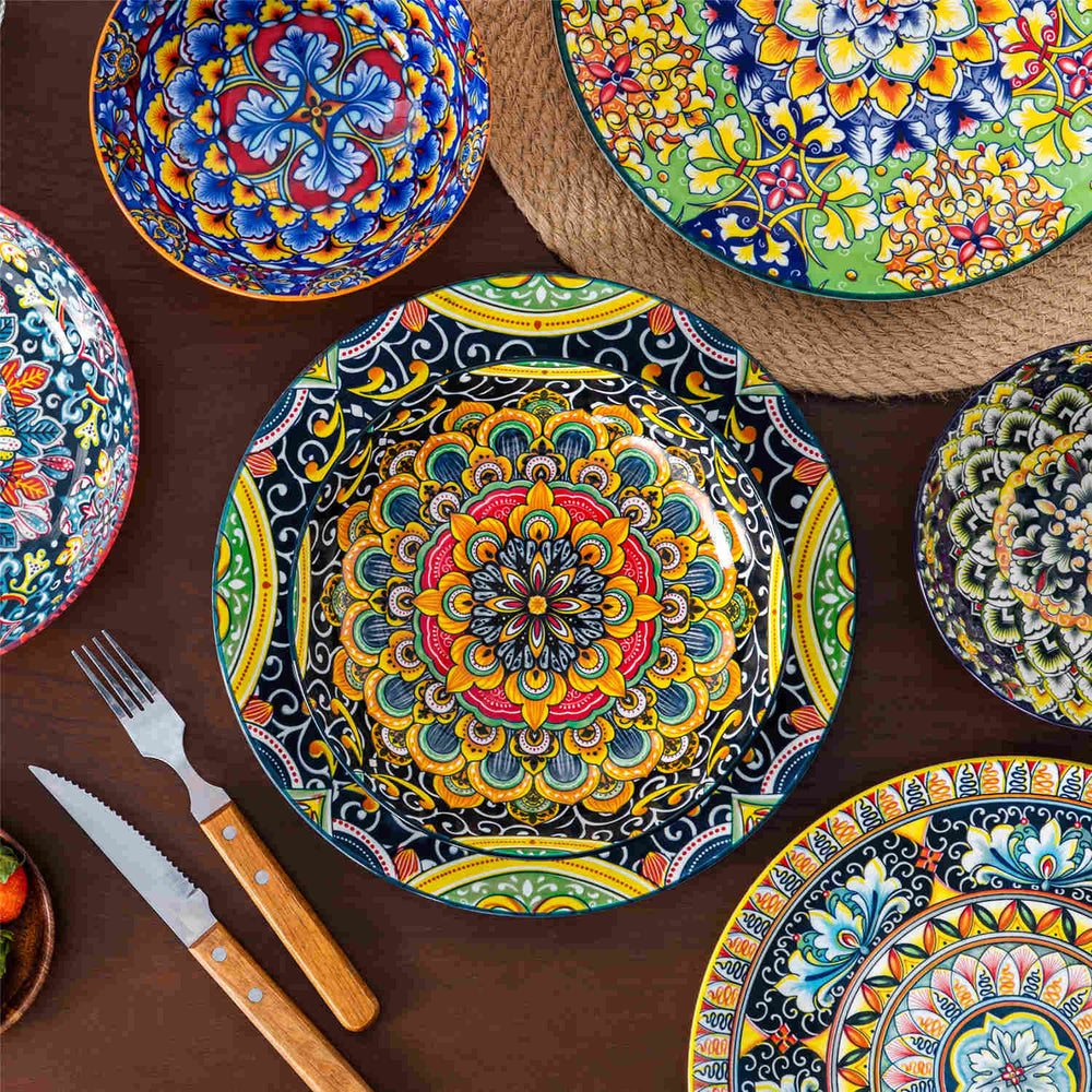 Our vibrant Simi 18-piece dinnerware set brings Bohemian flair to your table with a rich palette of water blue, dark green, red, dark blue, yellow, and orange. Made from high-quality porcelain, this set includes dinner plates, salad plates, and cereal bowls for 6. The sleek glaze finish enhances the intricate patterns and smooth texture, while the cereal bowls feature a unique embossed diamond exterior and detailed floral motifs inside, adding a luxurious touch to every meal.