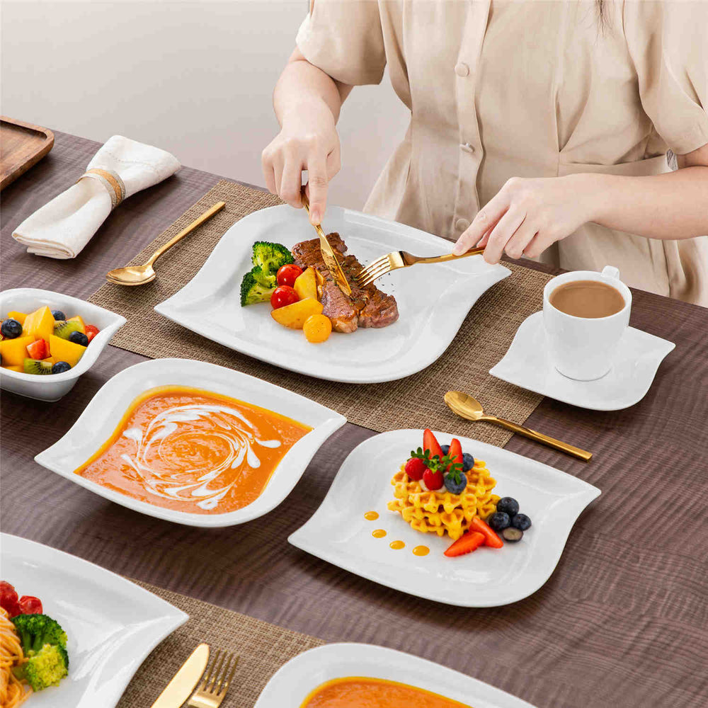 Inspired by the elegance of nature, the Elvira 36-Piece Dinnerware Set brings a touch of modern artistry to your table. The Elvira collection, available in ivory-white and marble grey, features leaf-shaped plates with subtle geometric accents, offering a sleek yet organic appeal. Designed for six, the set includes dinner plates, salad plates, soup bowls, cereal bowls, and cups with saucers. Safe for the microwave, oven, and dishwasher, it’s durable, stackable, and perfect for both refined dinners and relaxed gatherings.