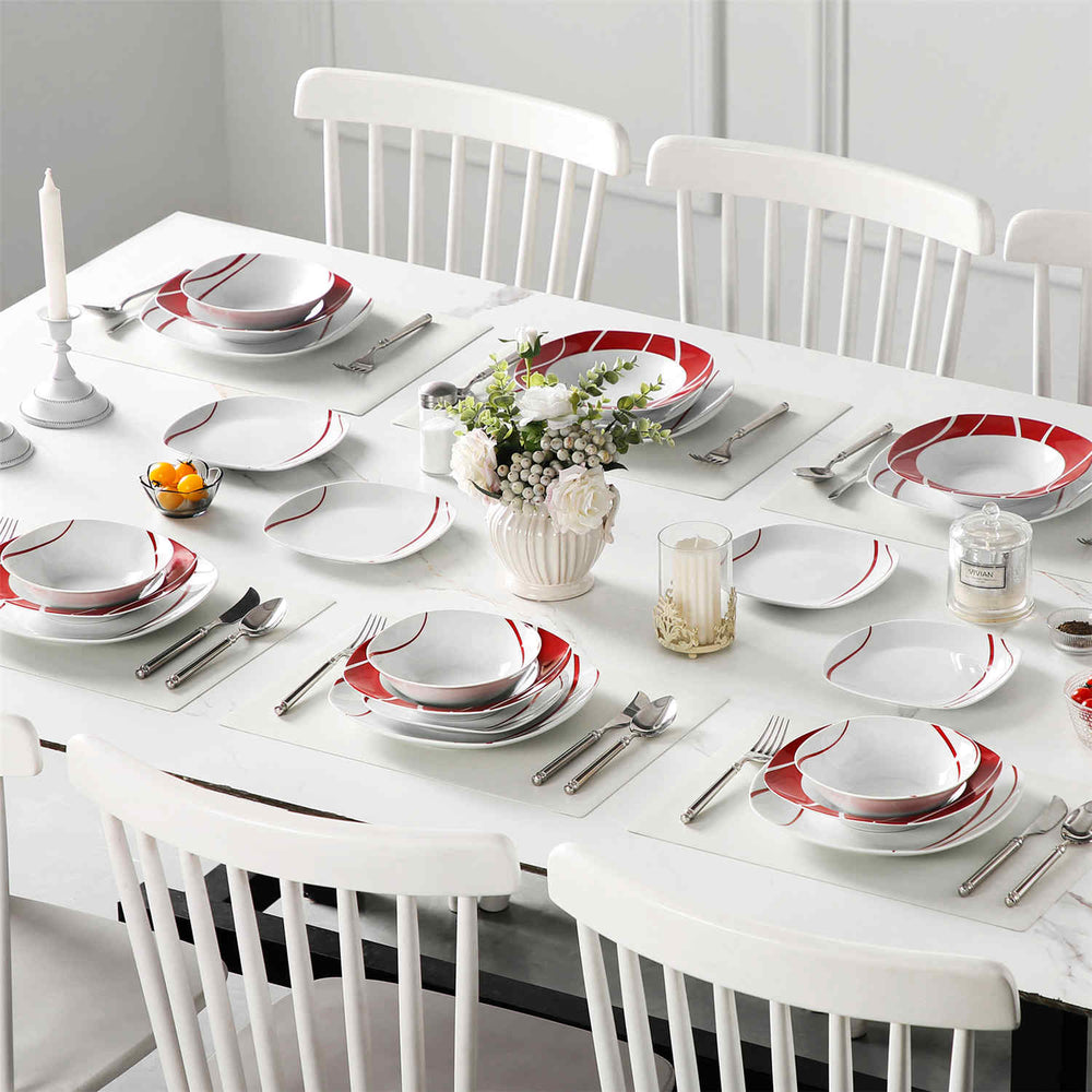 Designed with softly squared silhouettes and rounded corners, this dinnerware set offers a modern yet timeless aesthetic. The off-white glaze is accented by delicate red lines, adding a bold yet refined touch to your table. Perfect for serving 6, it includes dinner plates, dessert plates, soup plates, and cereal bowls. Crafted from durable, non-toxic porcelain, the set is microwave, oven, and dishwasher safe for effortless use and cleanup. Whether for holiday gatherings, family dinners, or festive celebrations, Felisa brings elegance and practicality to every occasion.