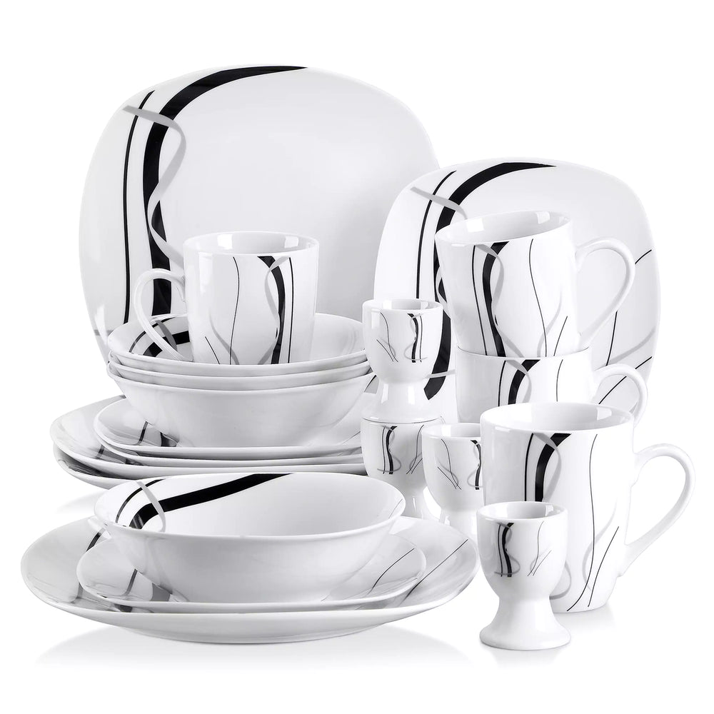 Blending modern design with timeless appeal, the Fiona dinnerware set features a refined rounded square shape and a striking black and silvery stripe design on a glossy off-white glaze. This set for four includes dinner plates, dessert plates, cereal bowls, mugs, and egg stands, adding style to any table. Made from durable, non-porous porcelain, it resists stains, cleans easily, and is safe for the microwave, oven, and dishwasher. Stackable for efficient storage, this set is ideal for both casual meals and special gatherings.