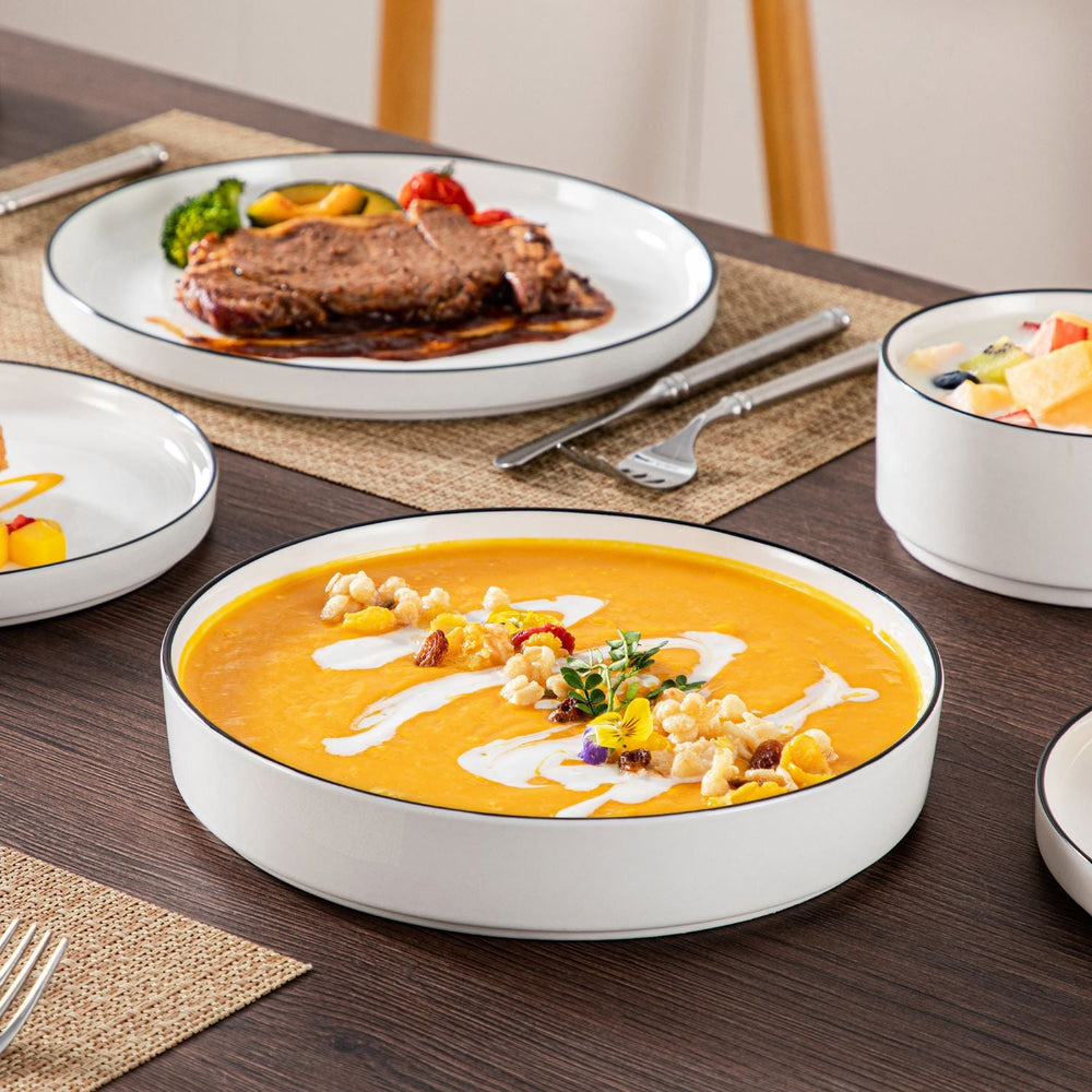 Available in pristine ivory white or with a striking black trim, this set serves six and includes dinner plates, salad plates, pasta bowls, and cereal bowls. Each piece features sleek lines and a straight edge, offering a modern take on the classic round design. Elevated, non-slip bases provide a secure grip, making this set versatile for kitchen, dining room, and outdoor use. Crafted from durable porcelain, this collection ensures long-lasting performance with a focus on sustainability. The neutral tones enhance the vibrant colors of your dishes, elevating the visual appeal of every meal. Microwave, dishwasher, and oven safe, these pieces are designed for easy stacking and storage.
