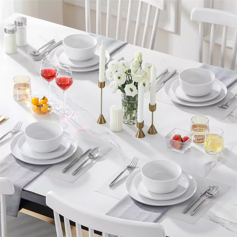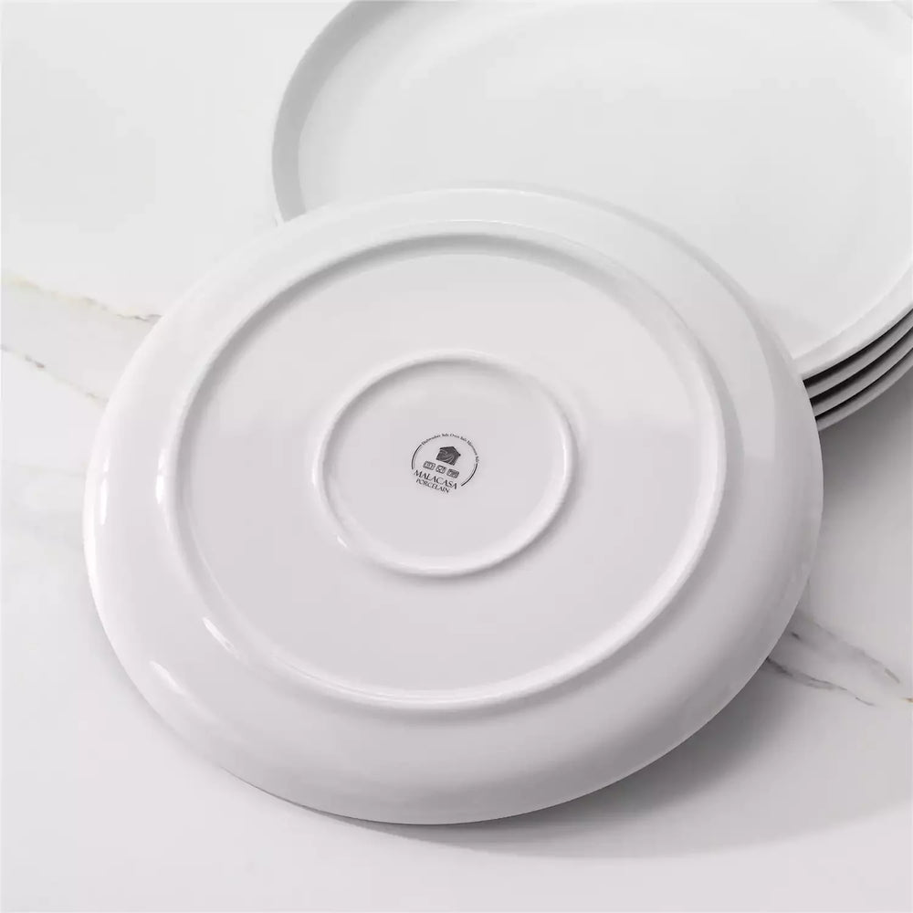 Each piece showcases a soft off white porcelain body, with dinner and salad plates shaped in subtle arcs that rise into gently lifted rims—clean and composed from every angle. Deep, rounded bowls balance utility with grace, perfect for everything from brothy noodles to grain salads. Microwave- and oven-safe, the set stacks neatly and suits both everyday dining and relaxed entertaining.
