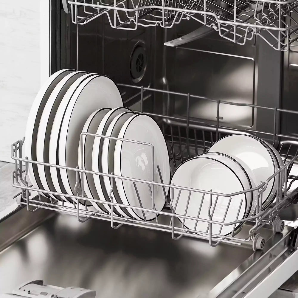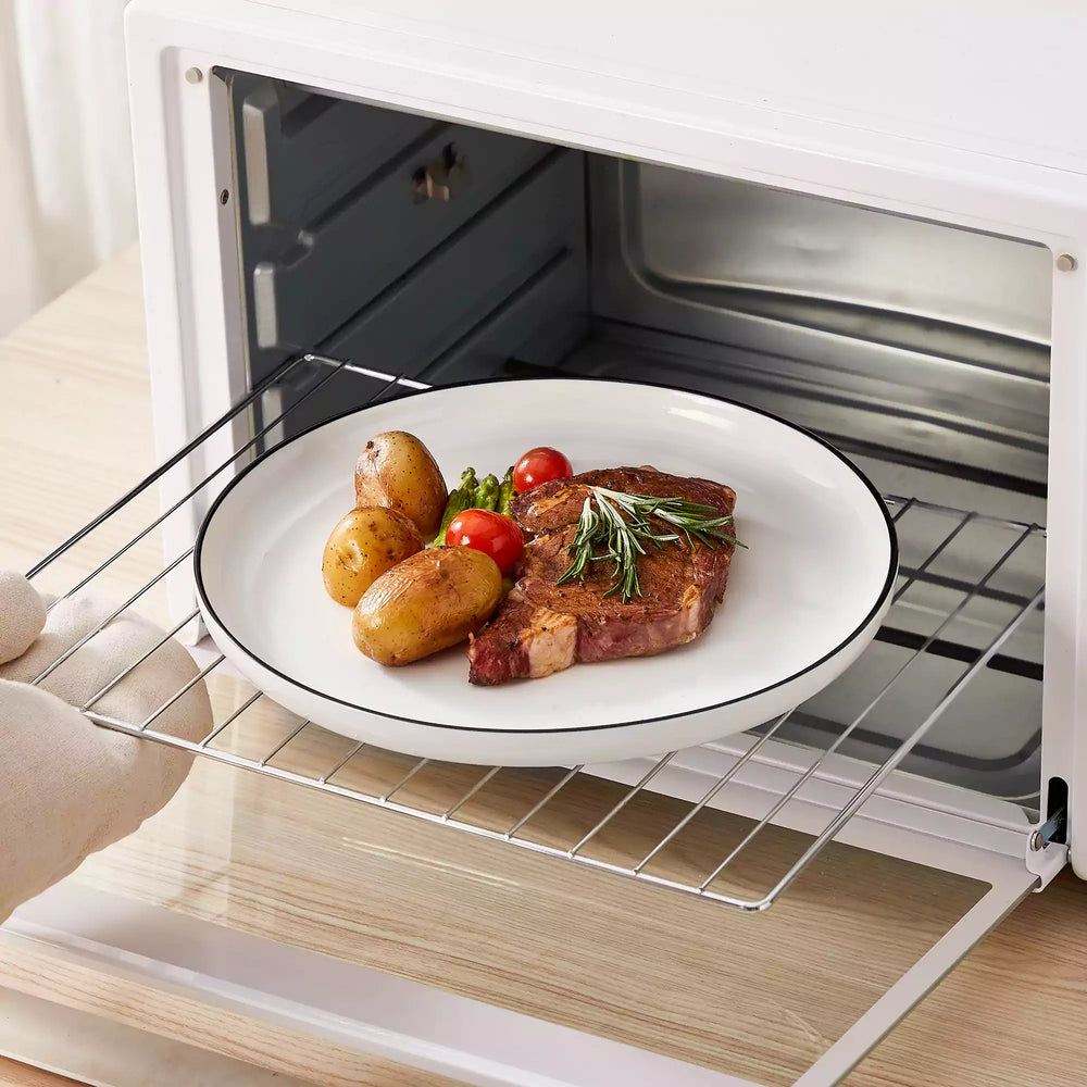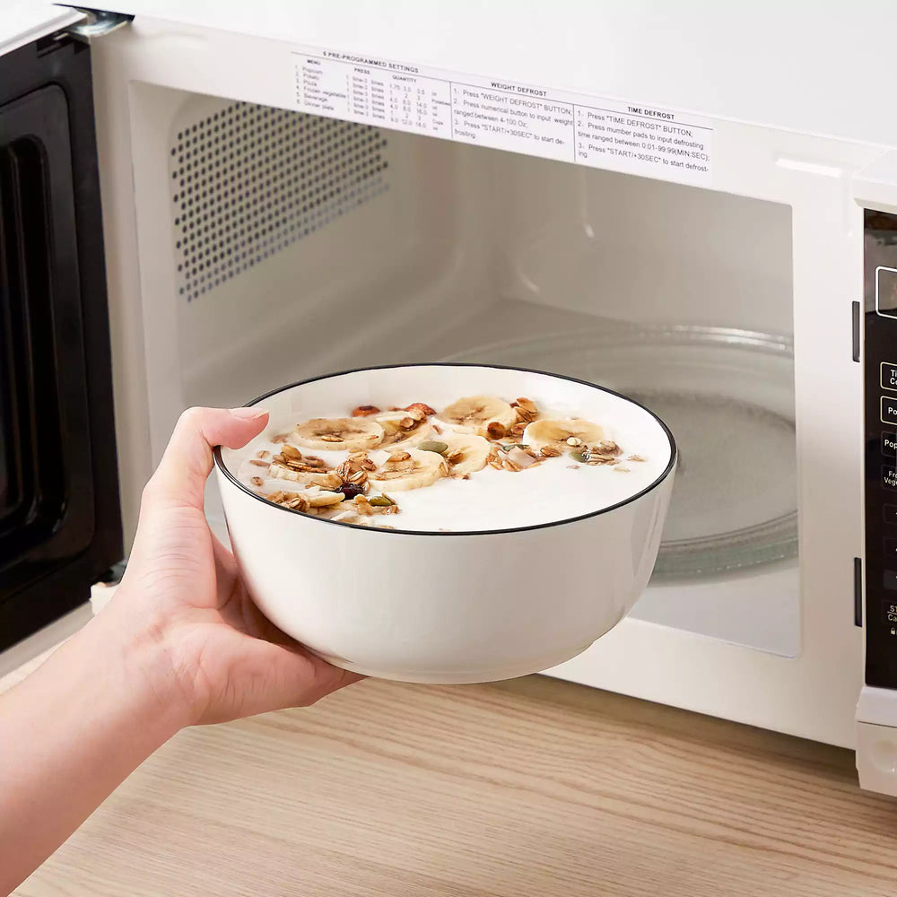 This 12-piece set brings the calm, modern aesthetic of the MINA Collection to your table. Includes 4 dinner plates, 4 dessert plates, and 4 cereal bowls, all with gently raised rims and rounded profiles. Available in ivory white or with black trim. Perfect for daily dining or small gatherings. Microwave, oven, and dishwasher safe.