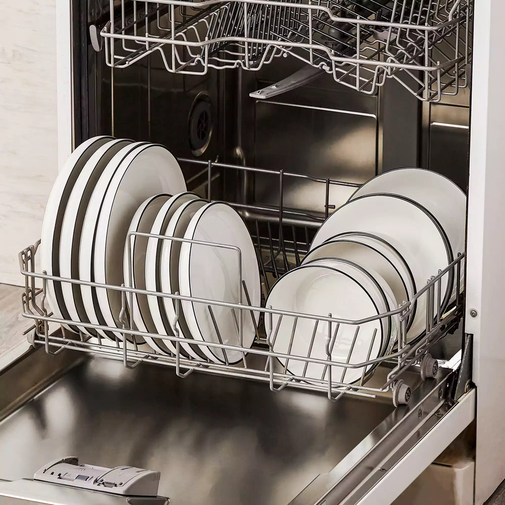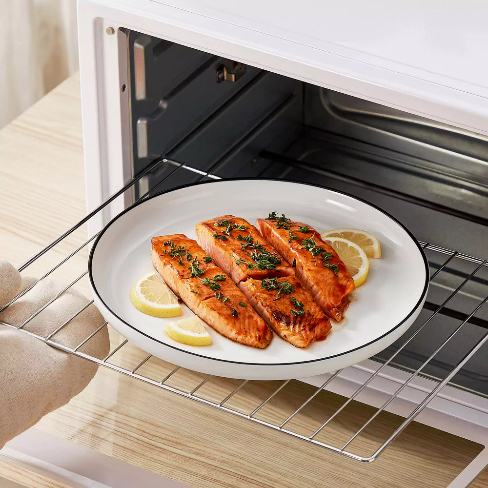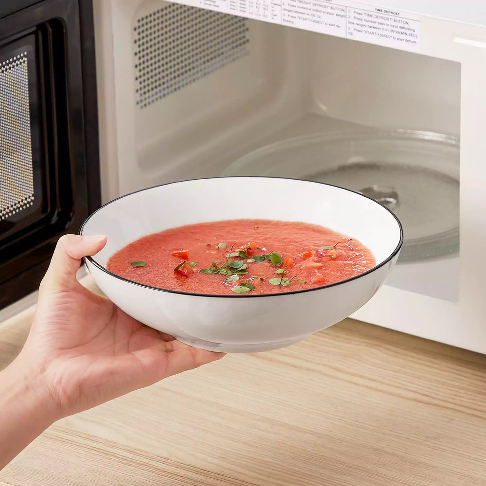 Designed for 4, this 16-piece set includes 4 dinner plates, 4 dessert plates, 4 cereal bowls, and 4 soup bowls. Softly raised rims and rounded profiles reflect the calm, modern aesthetic of the MINA Collection. Available in ivory white or with black trim. Ideal for everyday meals or small gatherings. Microwave, oven, and dishwasher safe.