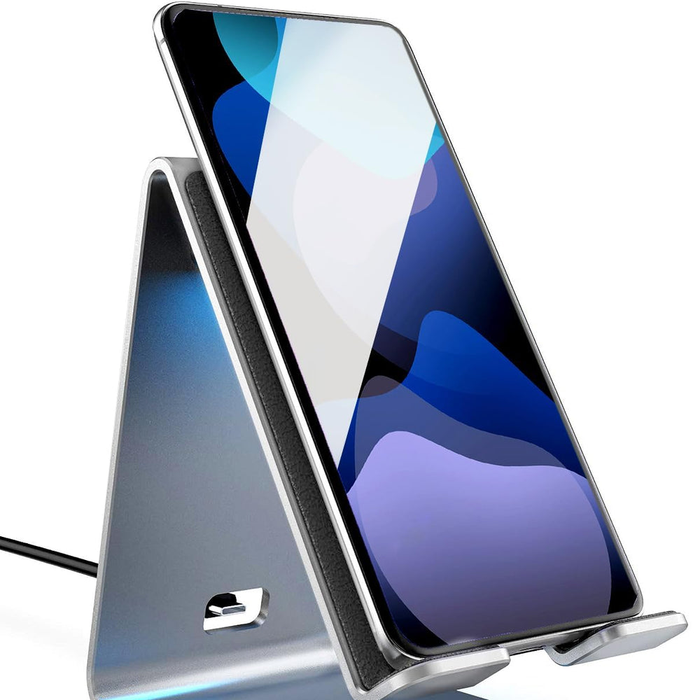 PowerStand Wireless Charging Stand with Dimmable LED Backlights - Desktop Charger for iPhone, Android and Galaxy Phone Models (Aluminum Silver)