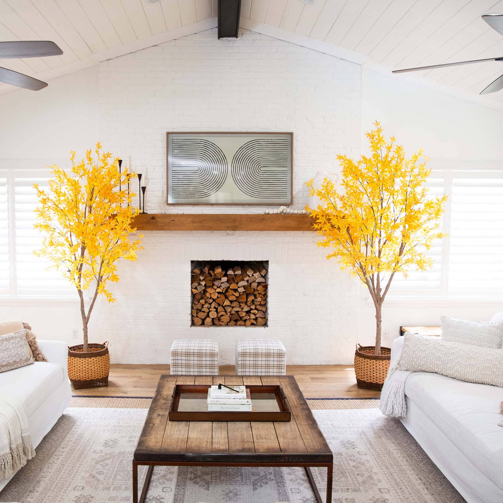 Fall in love with this golden-hued maple tree. Inspired by Vermont's breathtaking landscape in October, this fall tree brings the leaf peeping indoors with its vibrant maple leaves. Crafted from high-quality materials to ensure it lasts, this tree lets you create intimate memories with family year after year. Standing 9' tall from a nursery planter, this is a statement-making piece in any space. DIY and add to your favorite decorative pot. Ideal for Thanksgiving gatherings, it brings fall charm to rooms in need of a seasonal touch. Perfect for your home or office, its realistic look and classic design make it a timeless addition to any space.