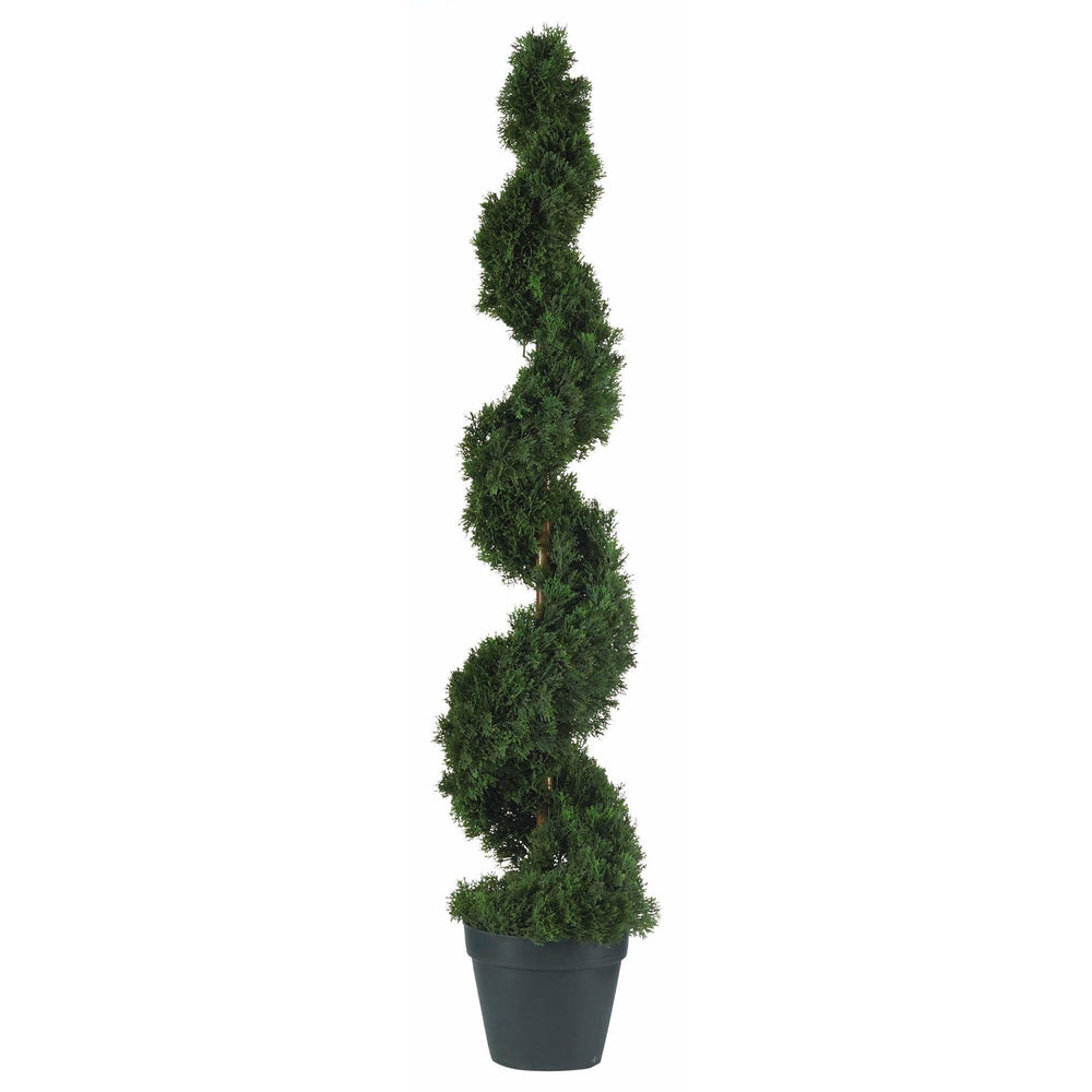 Crafted with quality and detail in mind this stunning cedar silk tree will brighten up any space. It features 1130 meticulously designed leaves each with an authentic texture. This spiral shaped cedar stands 4 ft tall and sits in a nursery pot. Perfect for a foyer or outdoor covered entrance way this Cedar Spiral tree will add that perfect touch of traditional colonial elegance to any in area in your home. Color: Green, Height: 4’.