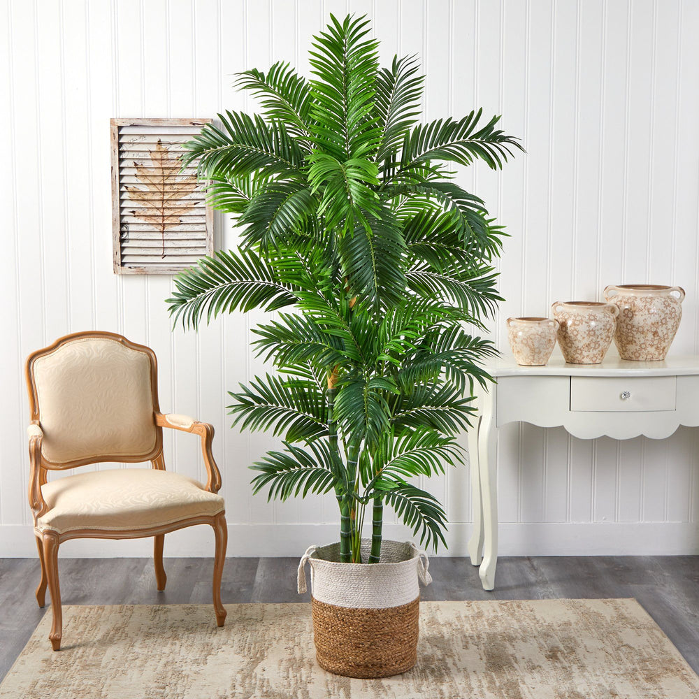 Transform your space into a tropical oasis with this Curvy Parlor Artificial Tree. One of the most popular house plants, you can now enjoy it even without a green thumb. Inspired by nature and manufactured from high-quality materials, this incredibly lifelike faux tree has intricate detailing in the palm fronds. Standing 6' from a jute planter (included in height), curate in any area. Perfect for a bathroom, lonely corner or guest room.
