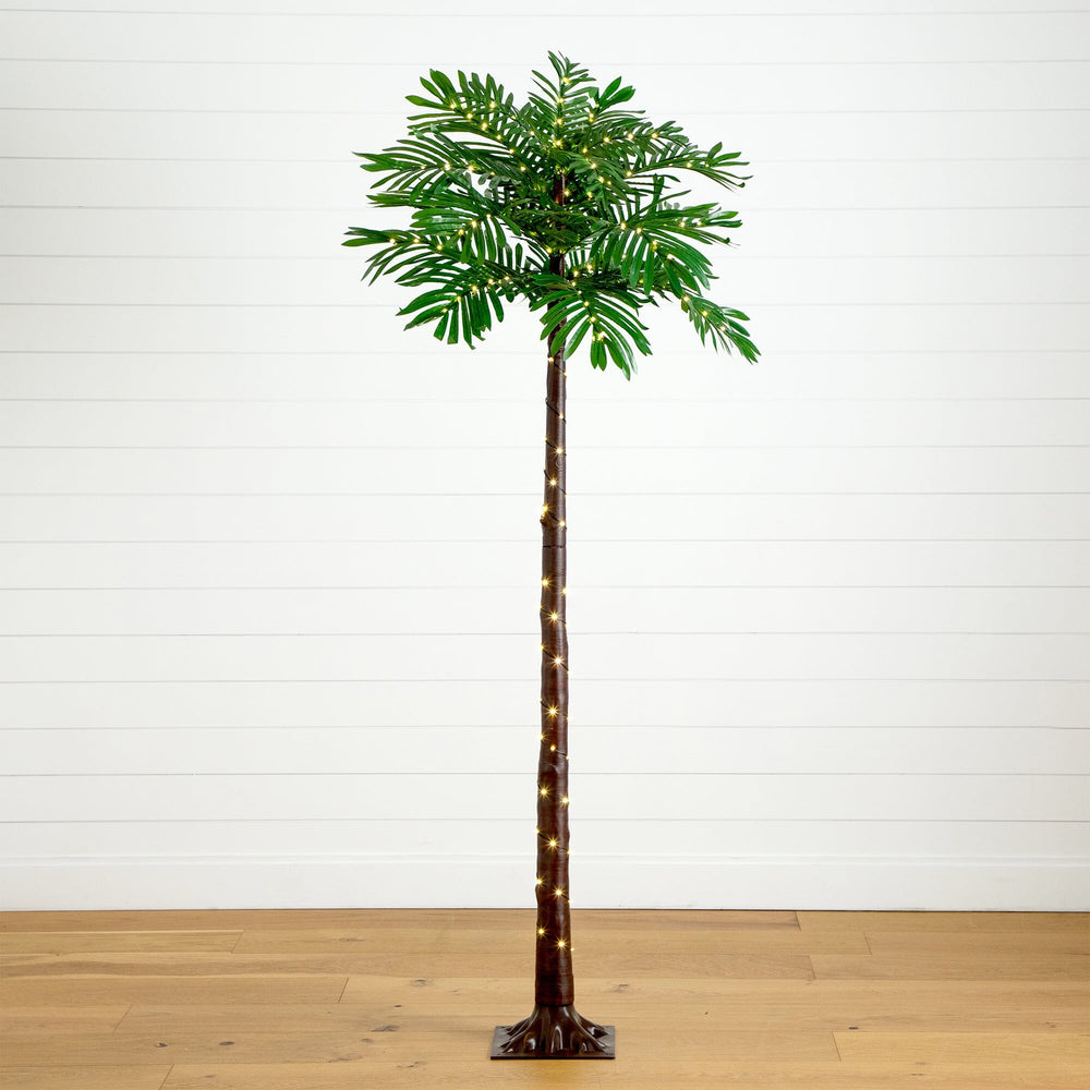 It's summertime faux-ever. Relive the season of fun with the artificial palm tree inspired by the dreamy Caribbean, you'll notice the details in every frond and dark brown trunk. Crafted from high-quality materials, bend the branches to fit in your space for a custom look. Pre-lit with 206 LED lights, this tree creates a soft, magical glow wherever it's displayed. Not only does it have warm lights, but you can extend the party outdoors and feel the magic of palm trees, no matter where you live, place this piece under a covered patio for an elevated glow. Standing 6' from a sturdy base, add in a planter of your choice. Transform your space into a paradise today, both indoor and outdoor. Place indoor during inclement weather to ensure it maintains its color and longevity.