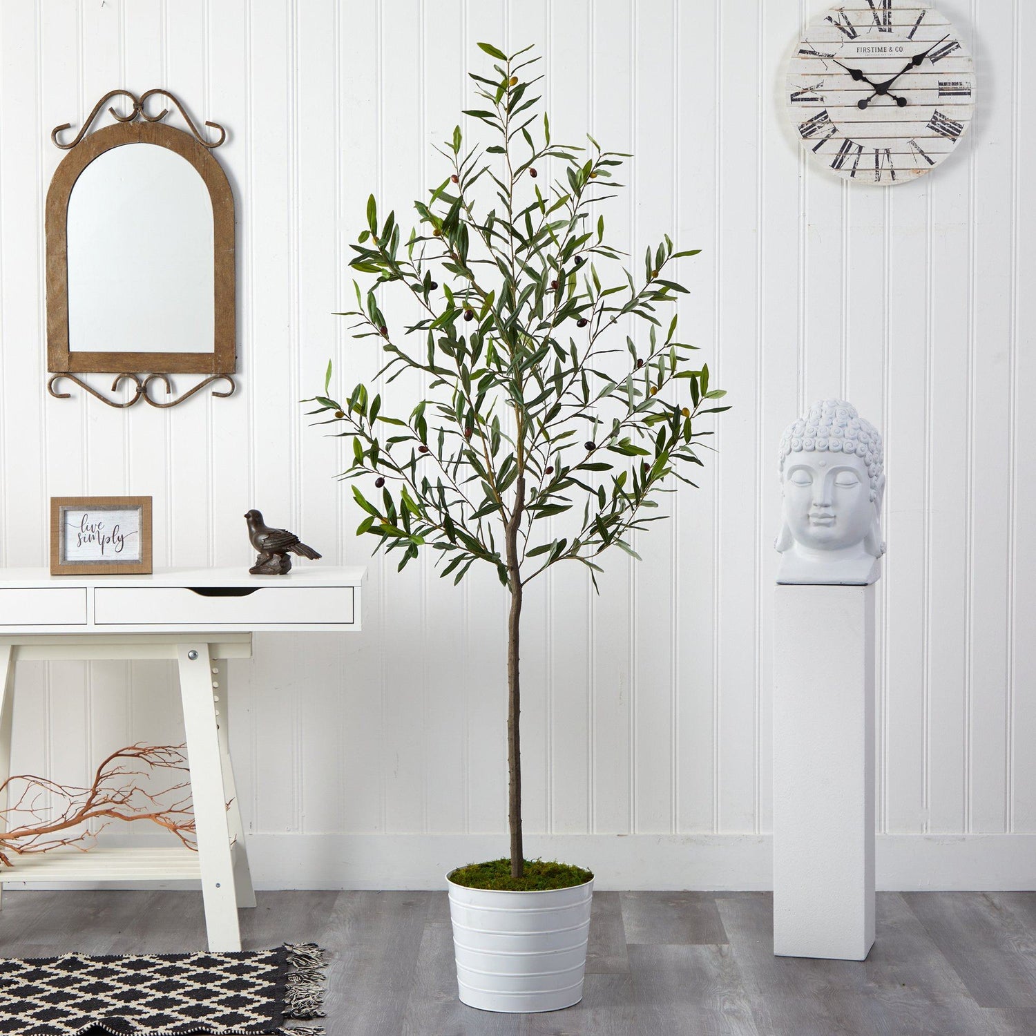 Cure your Italian wanderlust with this Olive Artificial Tree that will make all your Mediterranean dreams come true. Green olive leaves adorn the delicate stems that are accented by faux olives, so realistic you’ll want to eat them. Best of all? Zero Maintenance! This rustic faux olive tree stands 70" from a white tin planter (included in height), a Bello addition for tight spaces. Place in apartments, low ceiling rooms or bathrooms and instantly transform your space.