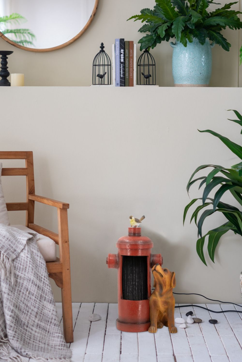 Enhance your outdoor space with this charming red fire hydrant water fountain, featuring playful dog and bird accents. Perfect for patios and garden areas, it combines function and decorative appeal.
